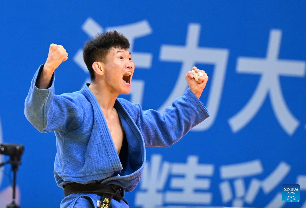 Ma Yulin of Shandong celebrates after defeating Wang Yuantao of Jiangsu in the men's Judo -60kg final at China's 15th National Games in Zhaoqing, south China's Guangdong Province, Nov. 10, 2025. (Xinhua/Zhu Xiang)
