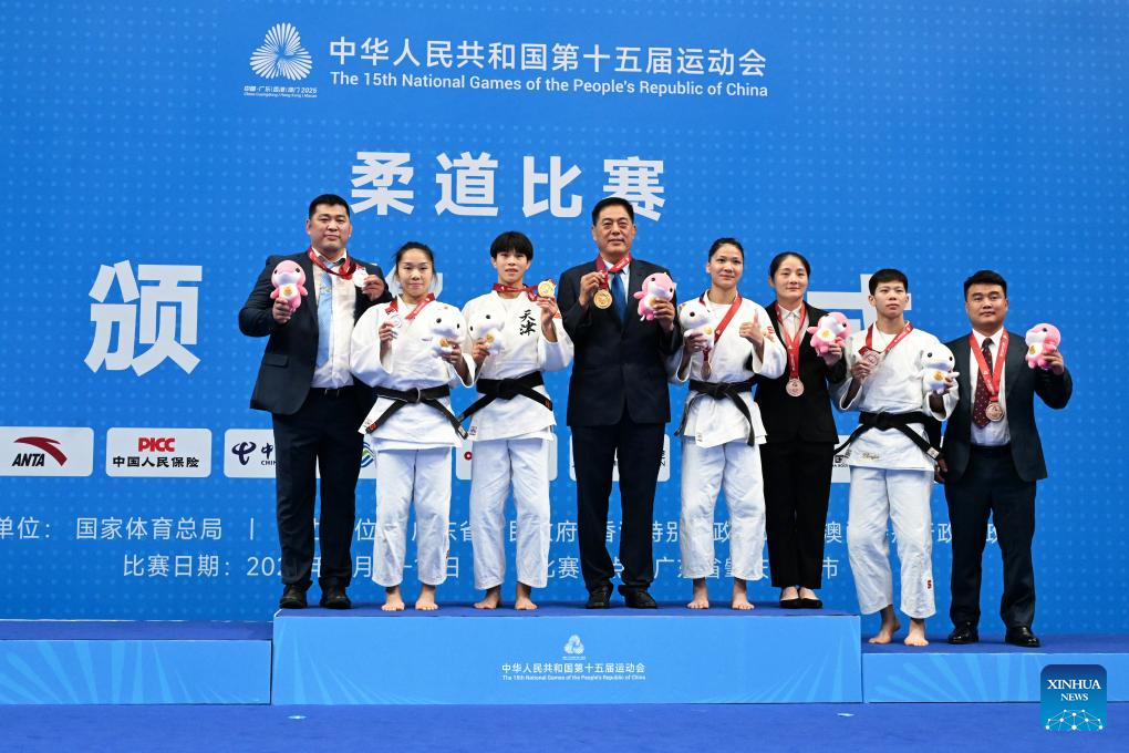 Gold medalist Tao Yuying of Tianjin, silver medalist Zhao Lile of Hebei, bronze medalist Lin Qianxi of Guangdong and bronze medalist Zhou Jia of Inner Mongolia pose for group photos with their coaches during the awarding ceremony for women's Judo -57kg at China's 15th National Games in Zhaoqing, south China's Guangdong Province, Nov. 10, 2025. (Xinhua/Zhu Xiang)