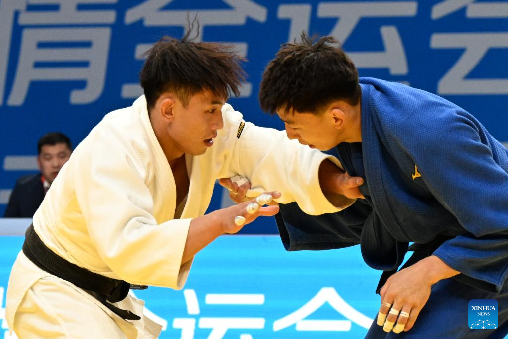 Xue Ziyang (L) of Heibei competes against Xiuduriga of Inner Mongolia during the men's Judo -66kg final at China's 15th National Games in Zhaoqing, south China's Guangdong Province, Nov. 10, 2025. (Xinhua/Zhu Xiang)