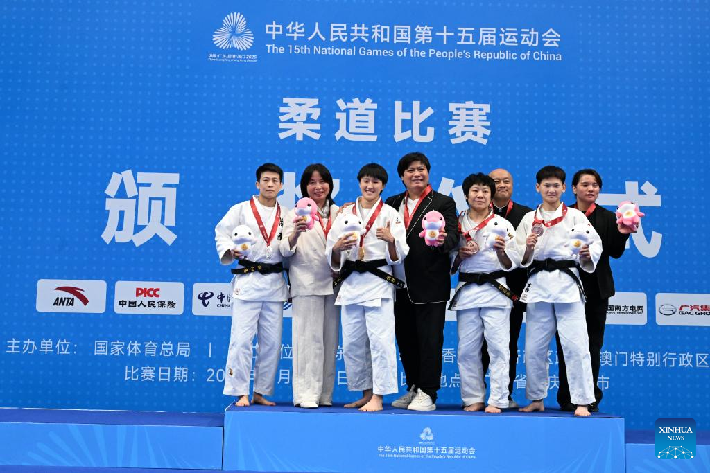 Gold medalist Yao Yuhong of Jiangsu, silver medalist Wu Yangying of Hunan, bronze medalist Liu Liping of Hunan and bronze medalist Li Jing of Hebei pose for group photos with their coaches during the awarding ceremony of the women's Judo -52kg final at China's 15th National Games in Zhaoqing, south China's Guangdong Province, Nov. 10, 2025. (Xinhua/Zhu Xiang)