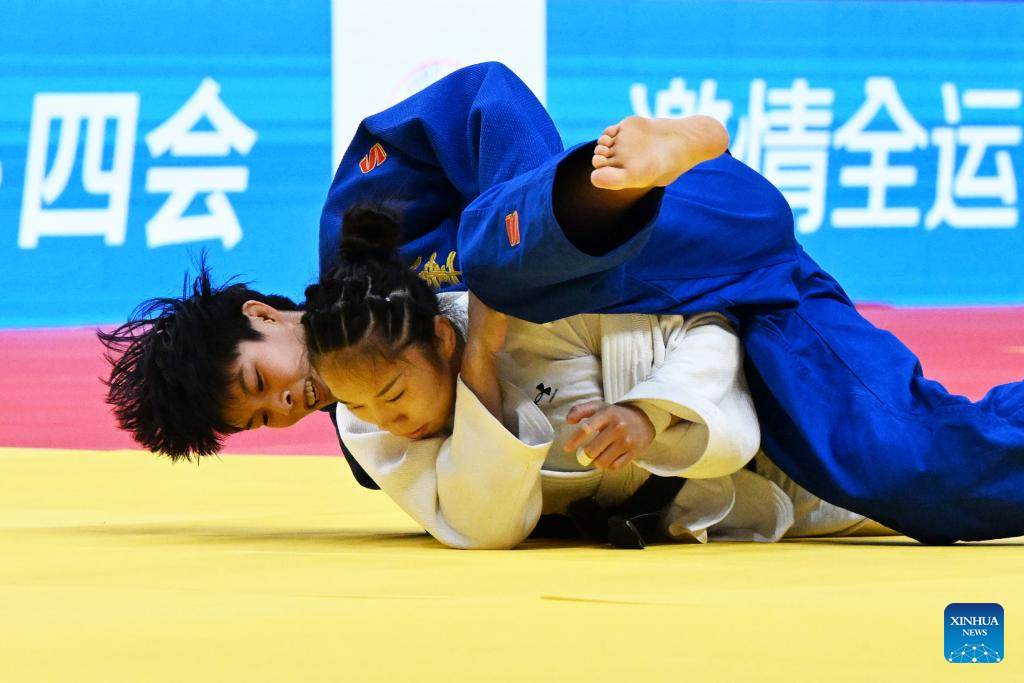 Tao Yuying (top) of Tianjin competes against Zhao Lile of Hebei during the women's Judo -57kg final at China's 15th National Games in Zhaoqing, south China's Guangdong Province, Nov. 10, 2025. (Xinhua/Zhu Xiang)