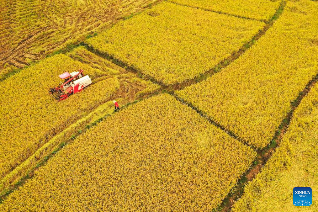 This aerial photo taken on Aug. 30, 2023 shows a farmer harvesting grains with a reaper in Huaqiao Village, Loudi City of central China's Hunan Province. (Photo by Li Jianxin/Xinhua)