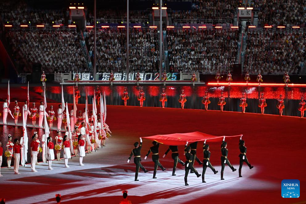 The Chinese national flag is carried during the opening ceremony of the games in Guangzhou, south China's Guangdong Province, Nov. 9, 2025. (Xinhua/Hu Huhu)
