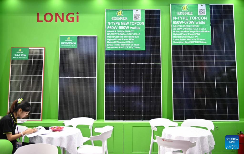 This photo taken on Oct. 15, 2024 shows the booth of a photovoltaic panel company during the Canton Fair in Guangzhou, south China's Guangdong Province.