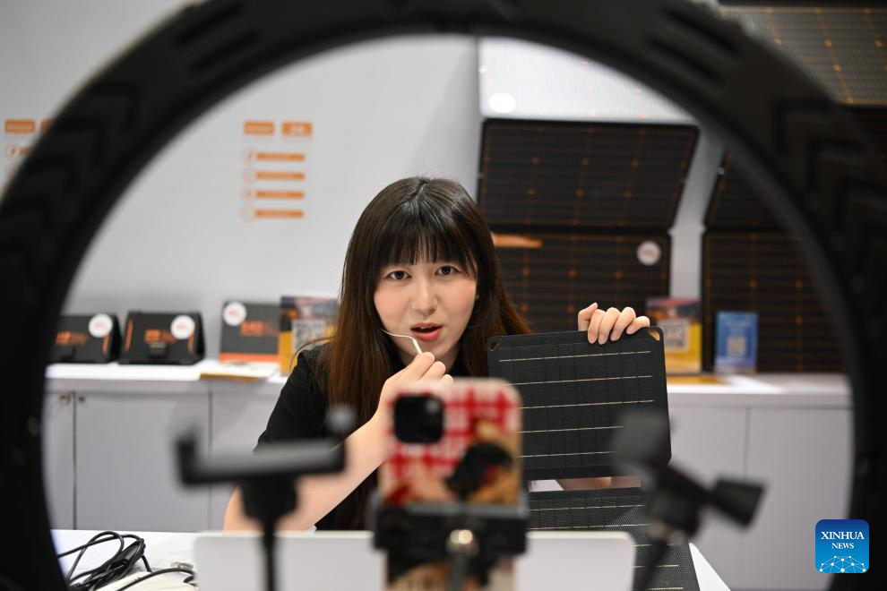 A staff member introduces a photovoltaic panel product through live-streaming during the Canton Fair in Guangzhou, south China's Guangdong Province, Oct. 15, 2024.
