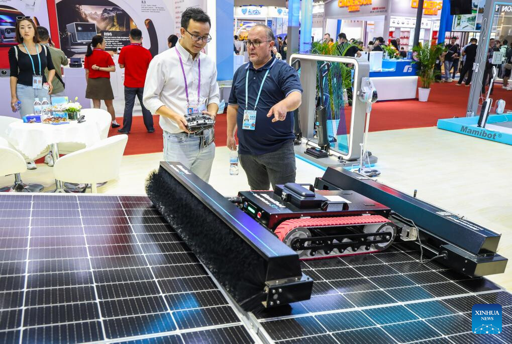 A purchaser talks with an exhibitor of an automatic solar panel cleaning robot during the Canton Fair in Guangzhou, south China's Guangdong Province, Oct. 15, 2024.