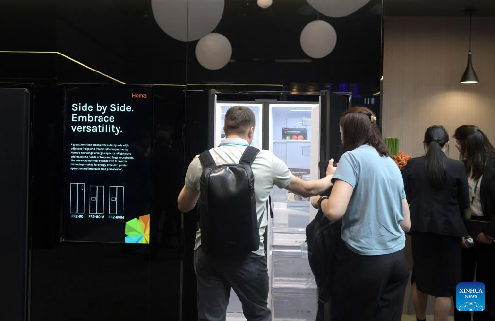 Visitors look at an energy-saving refrigerator during the Canton Fair in Guangzhou, south China's Guangdong Province, Oct. 15, 2024.