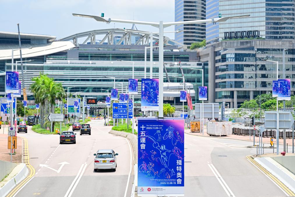 Photo taken on Aug. 1, 2025 shows the posters of China's 15th National Games in Hong Kong, south China. (Xinhua/Zhu Wei)