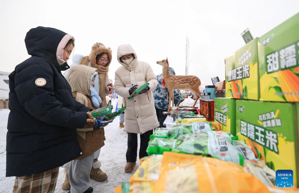 A vendor promotes local specialty products to tourists at a market of a camping festival in Qiqihar City, northeast China's Heilongjiang Province, on Jan. 12, 2026. The week-long camping festival opened here on Monday, where camping enthusiasts and tourists across China are allowed to experience the unique charm of camping and local folk customs in frigid chilliness. (Photo by Xu Shuai/Xinhua)