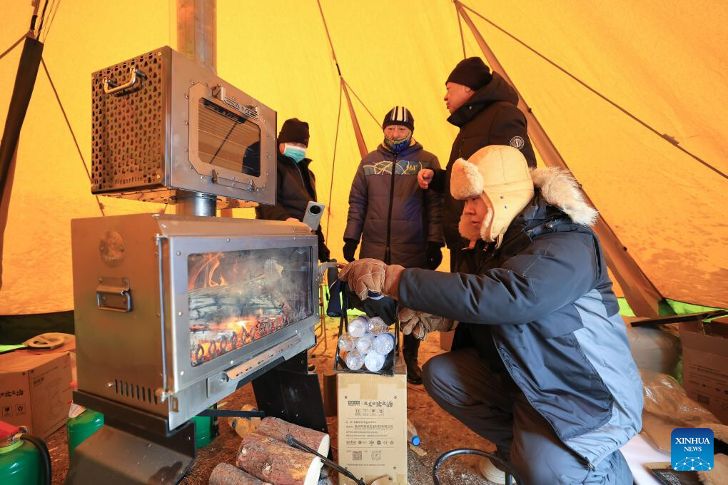 Camping enthusiasts make a fire inside a tent during a camping festival in Qiqihar City, northeast China's Heilongjiang Province, on Jan. 12, 2026. The week-long camping festival opened here on Monday, where camping enthusiasts and tourists across China are allowed to experience the unique charm of camping and local folk customs in frigid chilliness. (Photo by Xu Shuai/Xinhua)
