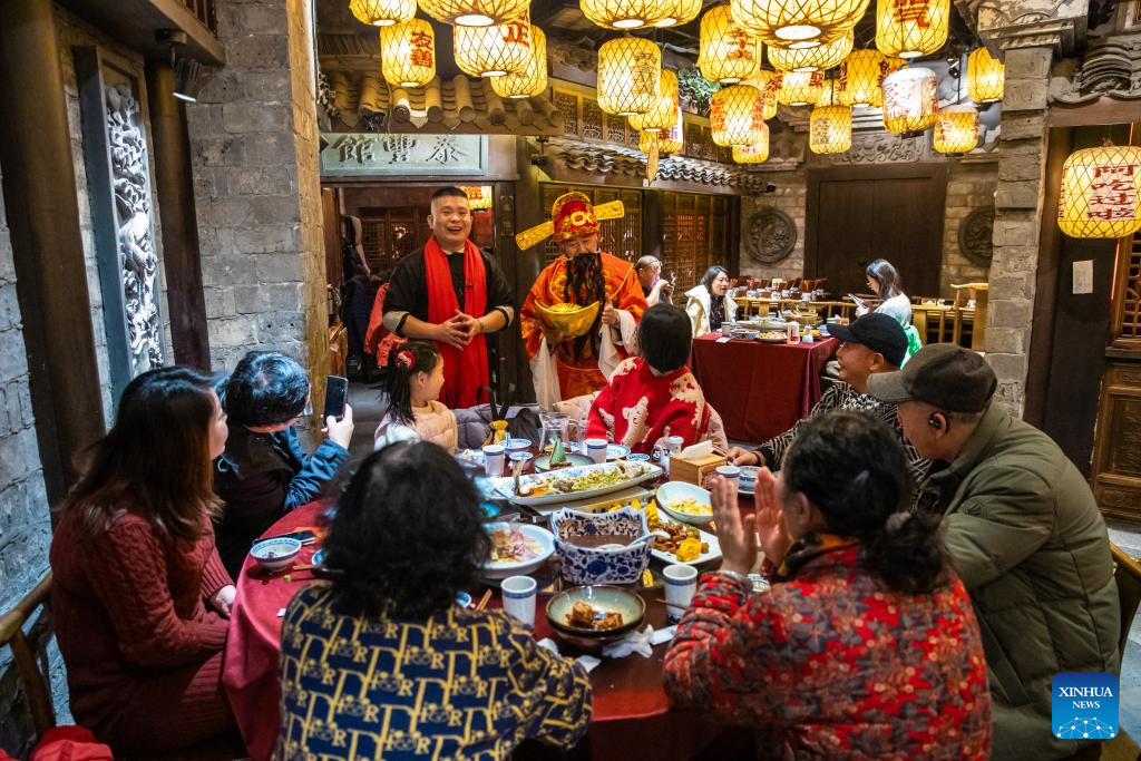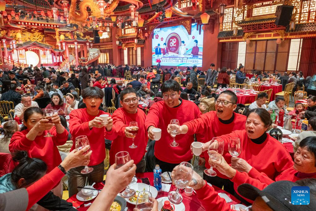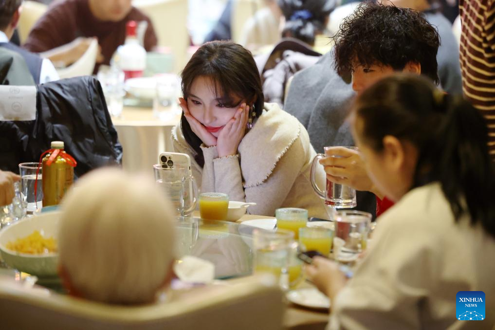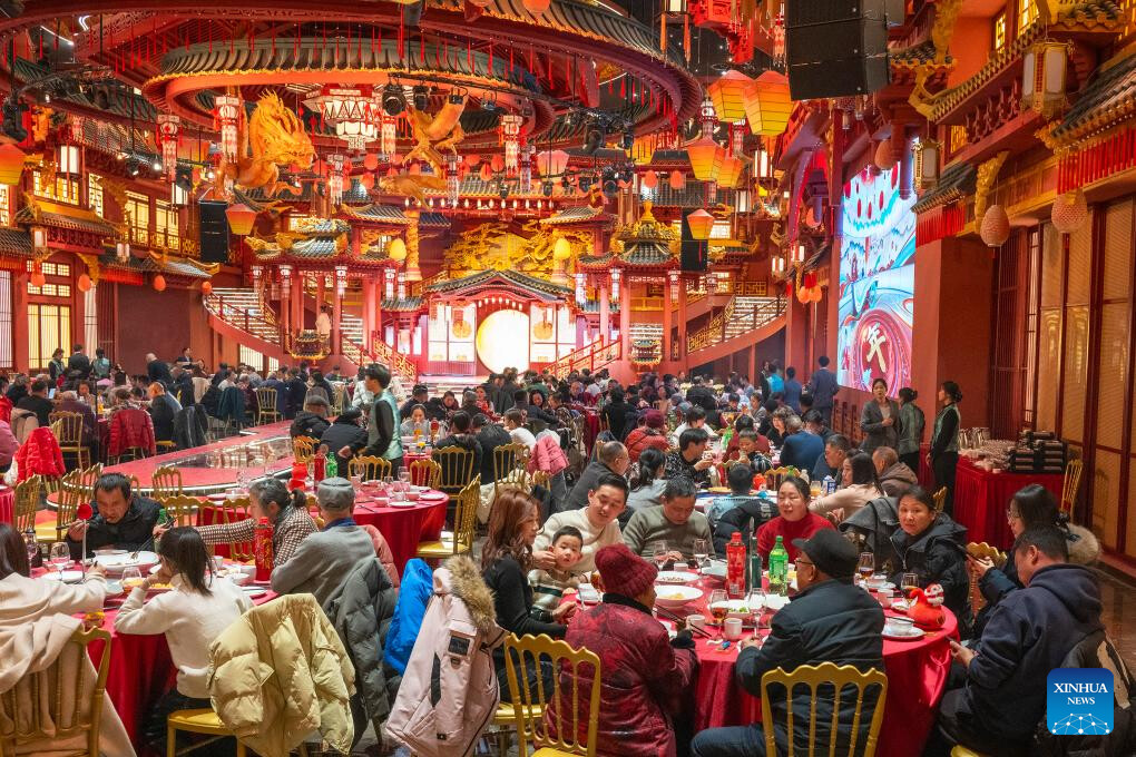 People have reunion meals at a restaurant in Nanjing City, east China's Jiangsu Province, Jan. 28, 2025. Dining with family members in a reunion meal has been a cherished tradition for the Chinese on the eve of the Spring Festival, which falls on Jan. 29 this year. (Photo by Zhang Meng/Xinhua)