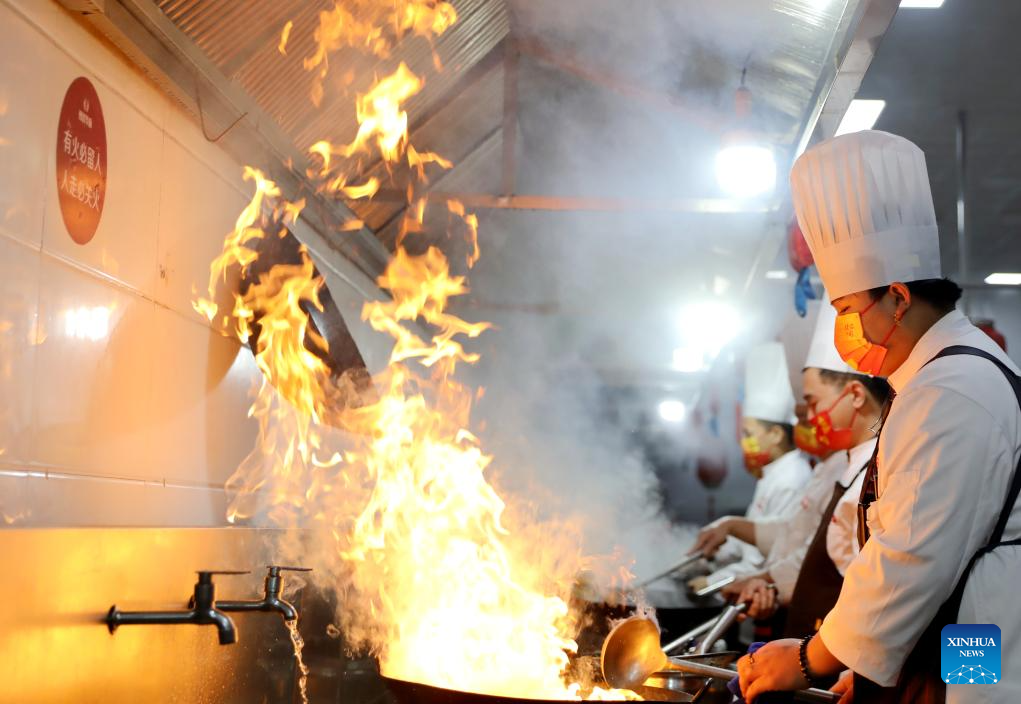 Chefs cook reunion meals at a restaurant in Jiyuan City, central China's Henan Province, Jan. 28, 2025. Dining with family members in a reunion meal has been a cherished tradition for the Chinese on the eve of the Spring Festival, which falls on Jan. 29 this year. (Photo by Duan Erping/Xinhua)