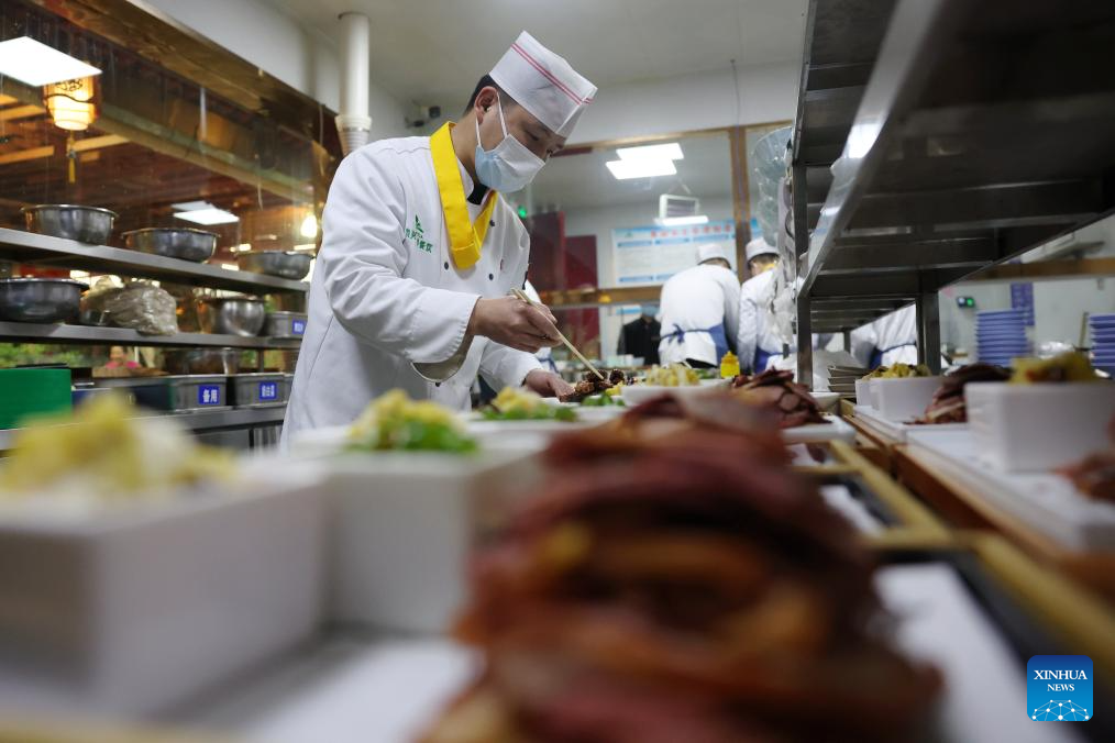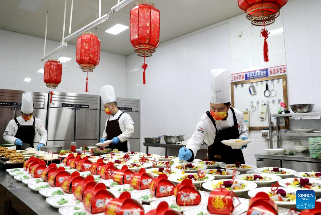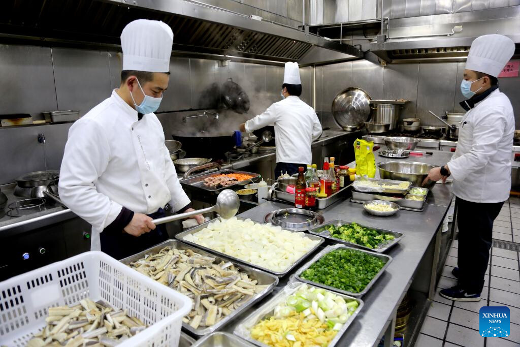 A worker arranges cooking of reunion meals at a restaurant in Nantong City, east China's Jiangsu Province, Jan. 28, 2025. Dining with family members in a reunion meal has been a cherished tradition for the Chinese on the eve of the Spring Festival, which falls on Jan. 29 this year. (Photo by Xu Congjun/Xinhua)