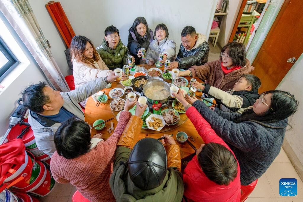 Villager Chen Fangjin has a reunion meal with his family members at Shanhouhu Village of Jinhua City, east China's Zhejiang Province, Jan. 28, 2025. Dining with family members in a reunion meal has been a cherished tradition for the Chinese on the eve of the Spring Festival, which falls on Jan. 29 this year. (Photo by Hu Xiaofei/Xinhua)