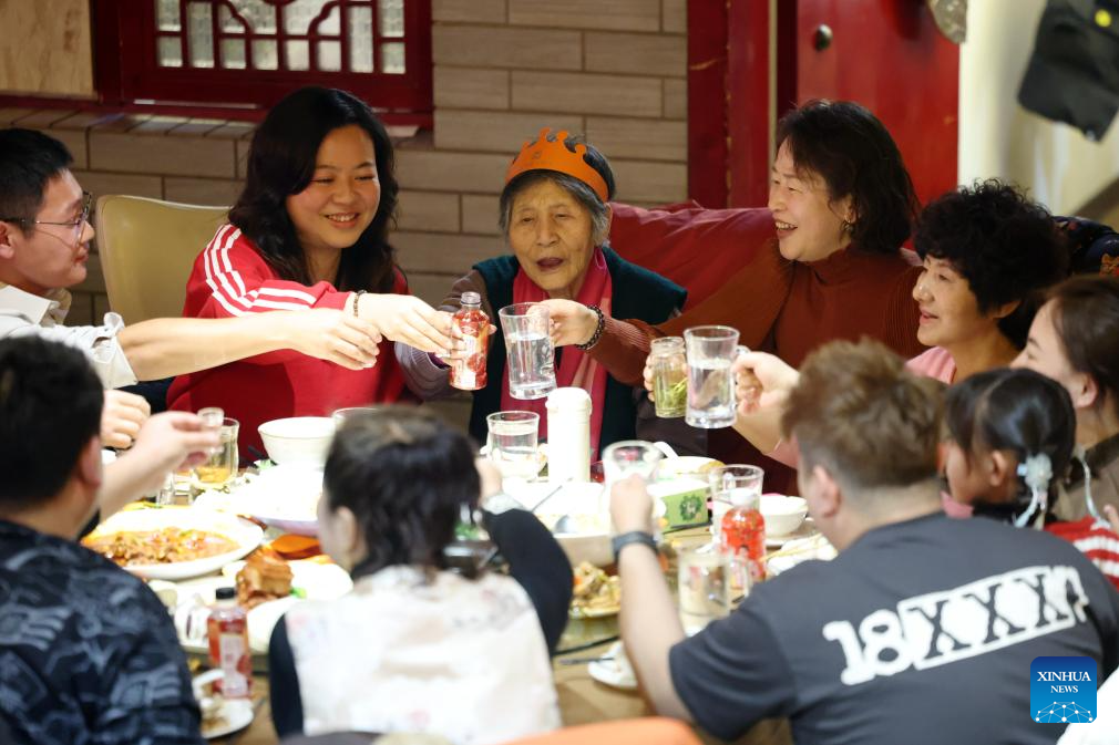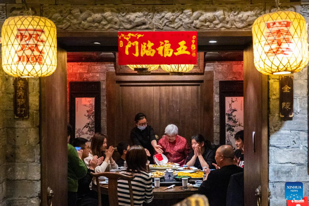 People have a reunion meal at a restaurant in Nanjing City, east China's Jiangsu Province, Jan. 28, 2025. Dining with family members in a reunion meal has been a cherished tradition for the Chinese on the eve of the Spring Festival, which falls on Jan. 29 this year. (Photo by Zhang Meng/Xinhua)