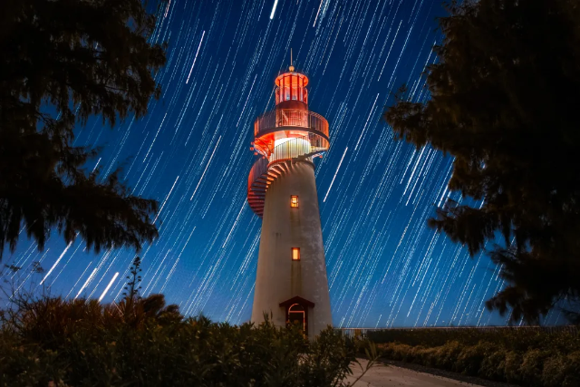Lighthouse under star trails at Spanish-style Town in Pinghai Town, Huidong County