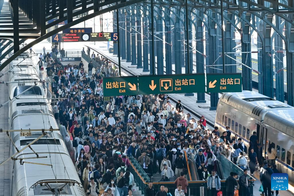 Passengers are pictured at Harbin Railway Station in Harbin, northeast China's Heilongjiang Province, on Oct. 1, 2025. The transportation network of the country witnessed a travel peak on the first day of the National Day holiday. (Photo by Yuan Yong/Xinhua)