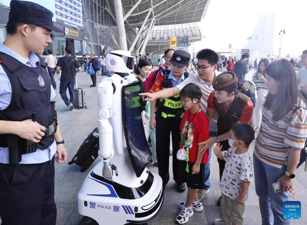 Children interact with a robot at Wuhan Railway Station in Wuhan, central China's Hubei Province, on Oct. 1, 2025. The transportation network of the country witnessed a travel peak on the first day of the National Day holiday. (Photo by Zhao Jun/Xinhua)