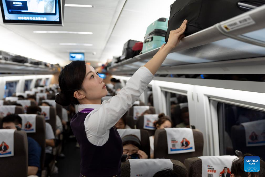 A train attendant of the Shanghai Passenger Transport Section tidies up luggage racks for passengers on Oct. 1, 2025. The transportation network of the country witnessed a travel peak on the first day of the National Day holiday. (Xinhua/Wang Xiang)