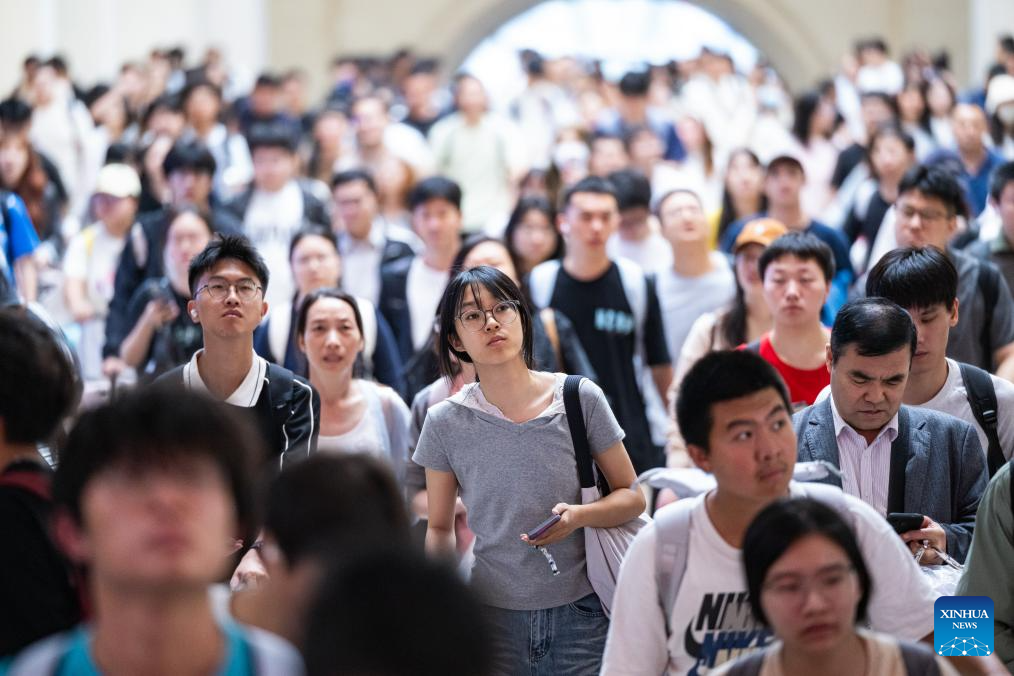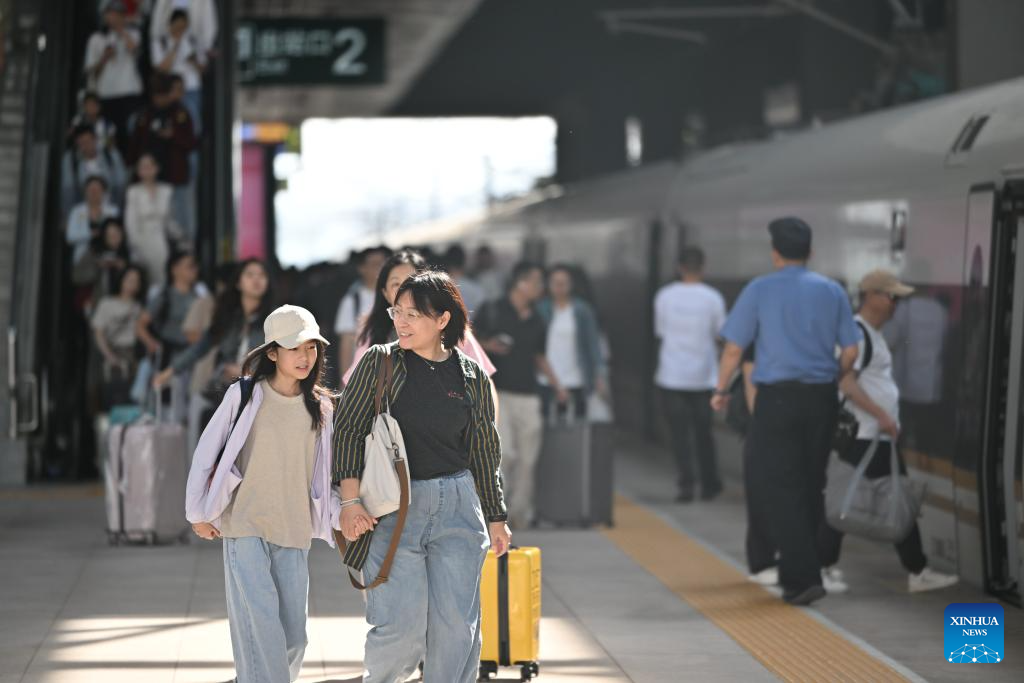 Passengers are pictured at Tianjin Railway Station in north China's Tianjin, on Oct. 1, 2025. The transportation network of the country witnessed a travel peak on the first day of the National Day holiday. (Xinhua/Li Ran)
