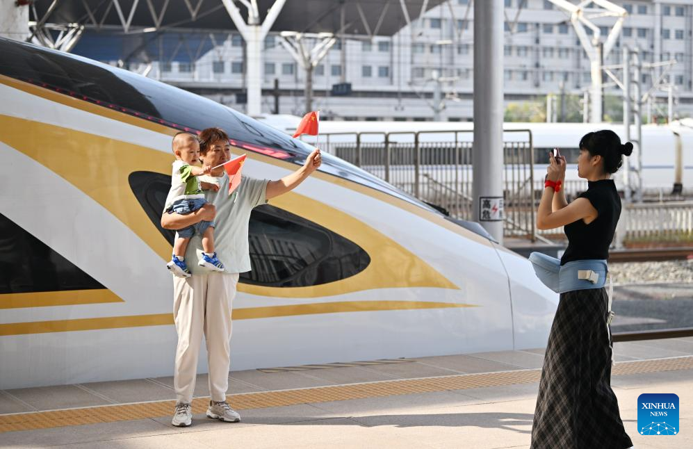 Passengers take photos beside a train at Tianjin Railway Station in north China's Tianjin, on Oct. 1, 2025. The transportation network of the country witnessed a travel peak on the first day of the National Day holiday. (Xinhua/Li Ran)