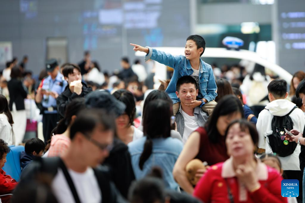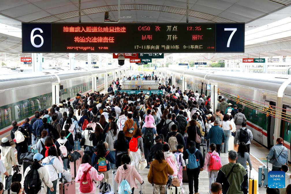 Passengers are pictured at Kunming Railway Station in Kunming, southwest China's Yunnan Province, on Oct. 1, 2025. The transportation network of the country witnessed a travel peak on the first day of the National Day holiday. (Photo by Zheng Yi/Xinhua)