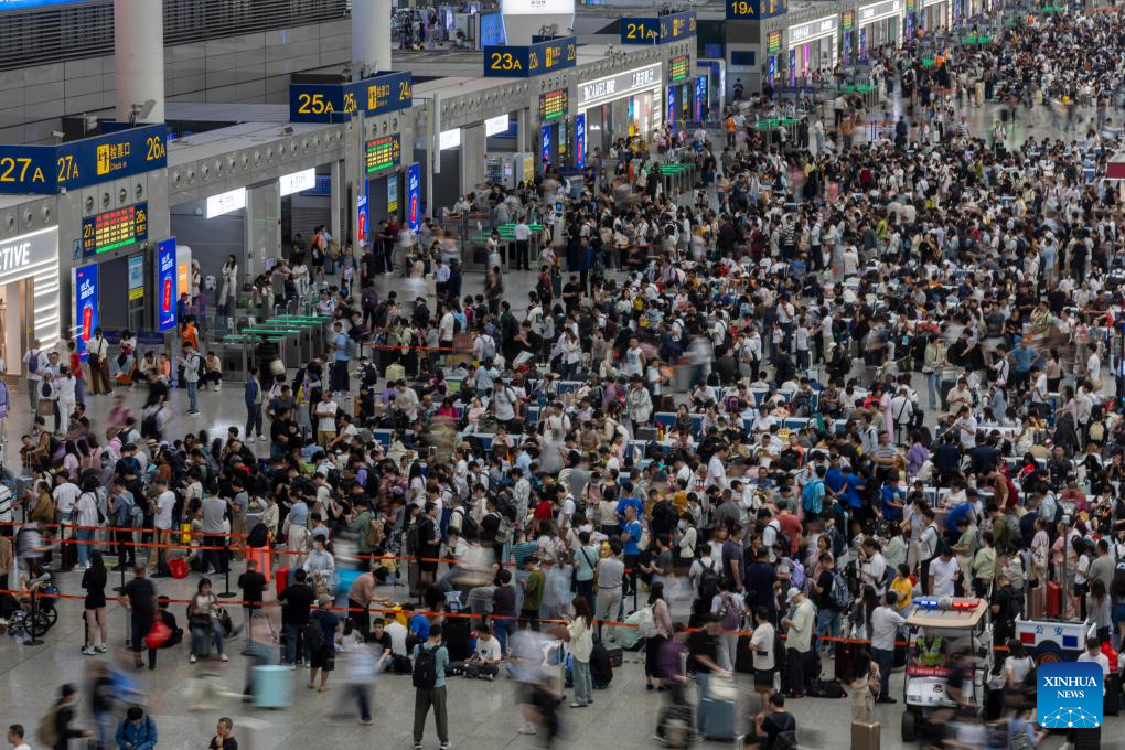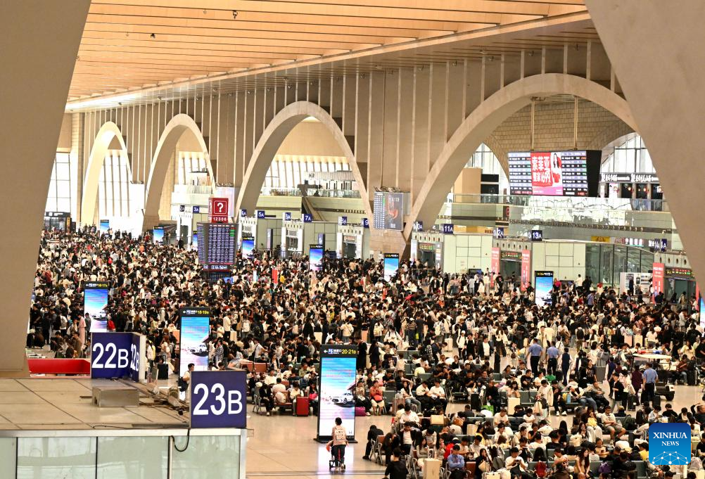 Passengers wait for trains at Guiyangbei Railway Station in Guiyang, southwest China's Guizhou Province, on Oct. 1, 2025. The transportation network of the country witnessed a travel peak on the first day of the National Day holiday. (Xinhua/Liu Xu)