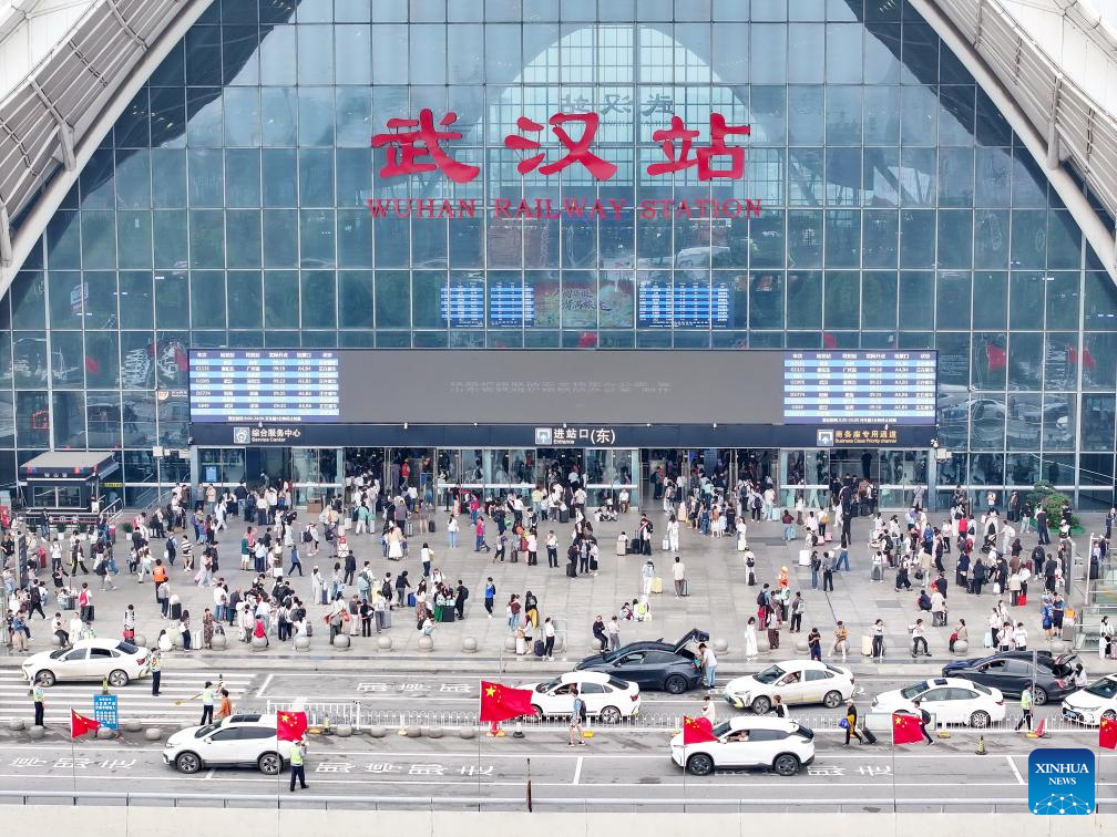 An aerial drone photo taken on Oct. 1, 2025 shows people at the east square entrance of Wuhan Railway Station in Wuhan, central China's Hubei Province. The transportation network of the country witnessed a travel peak on the first day of the National Day holiday. (Photo by Zhao Jun/Xinhua)