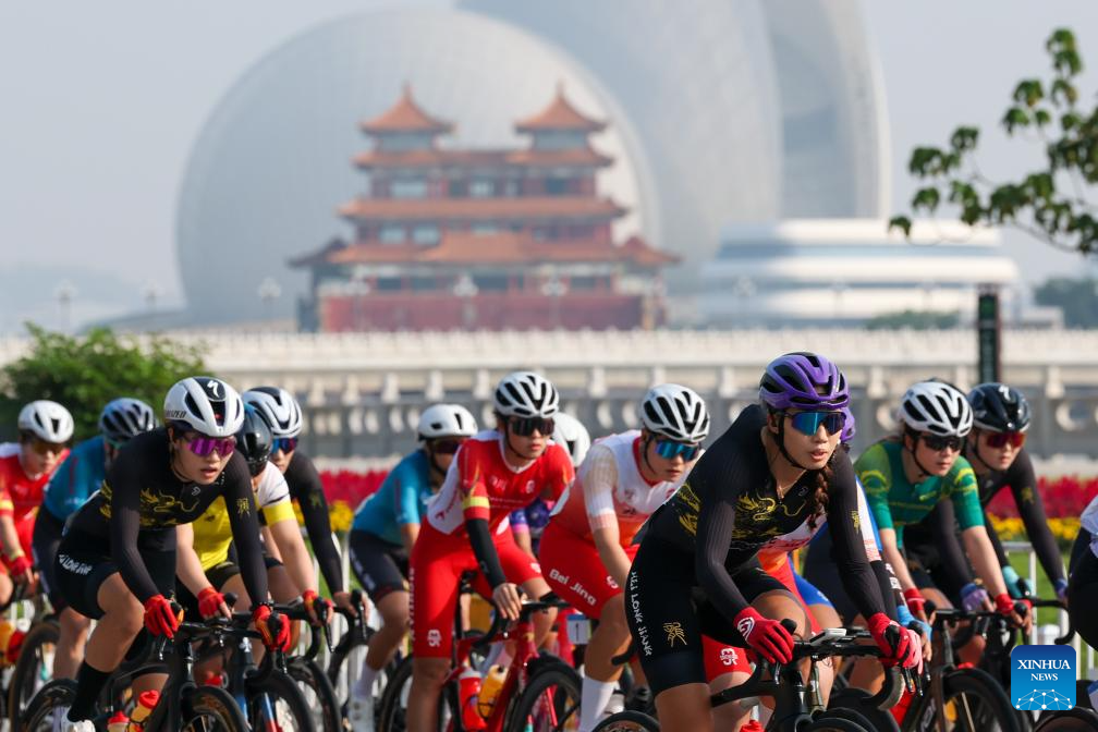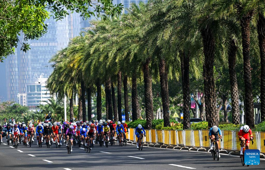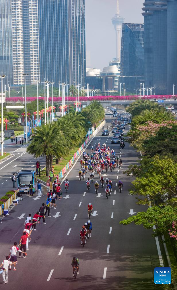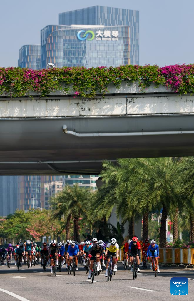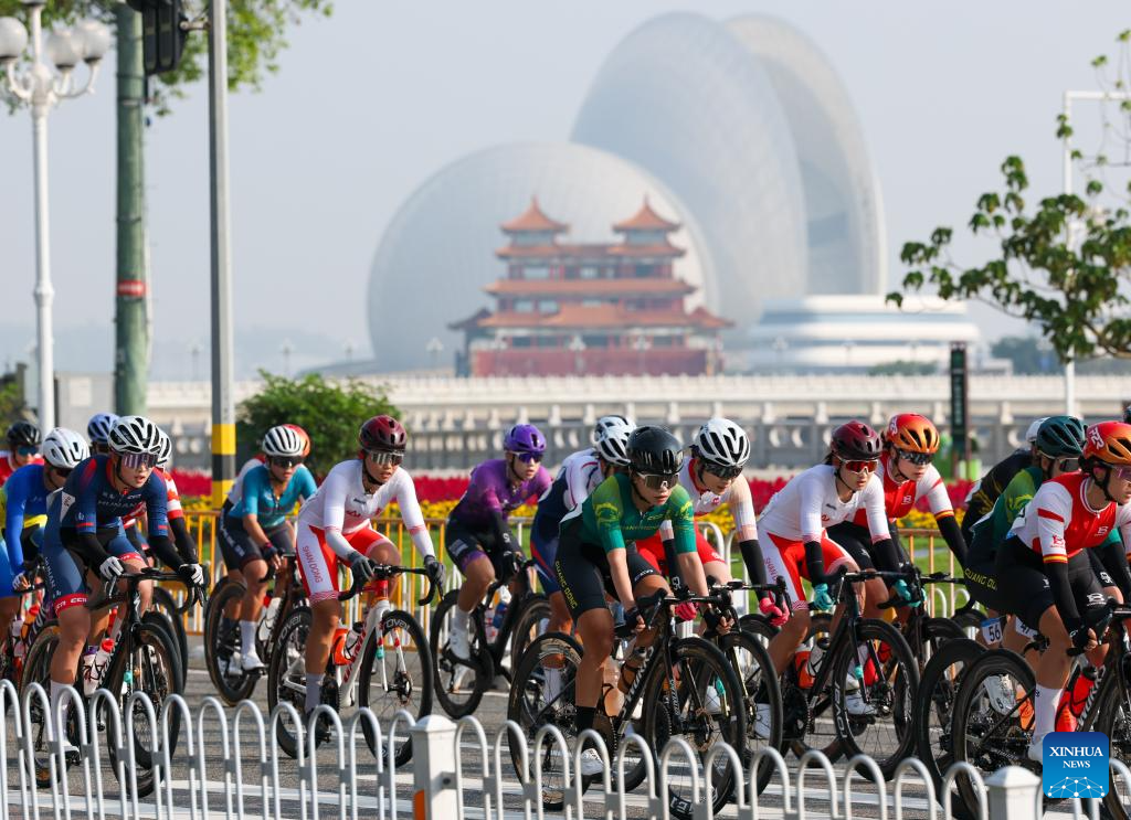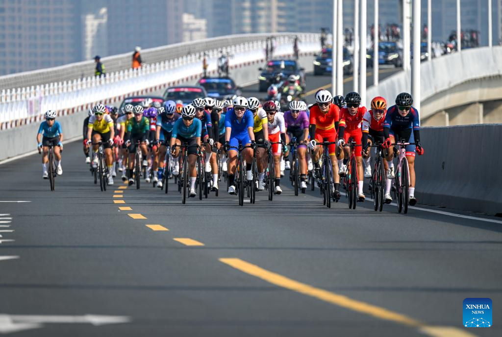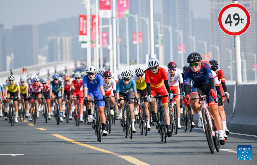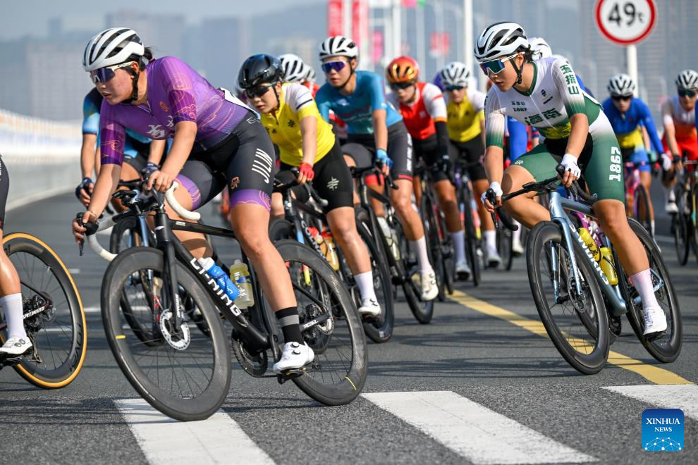 Cyclists compete during the women's road race of cycling road at China's 15th National Games in south China's Guangdong Province, Nov. 9, 2025. (Xinhua/Lian Zhen)