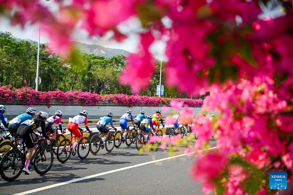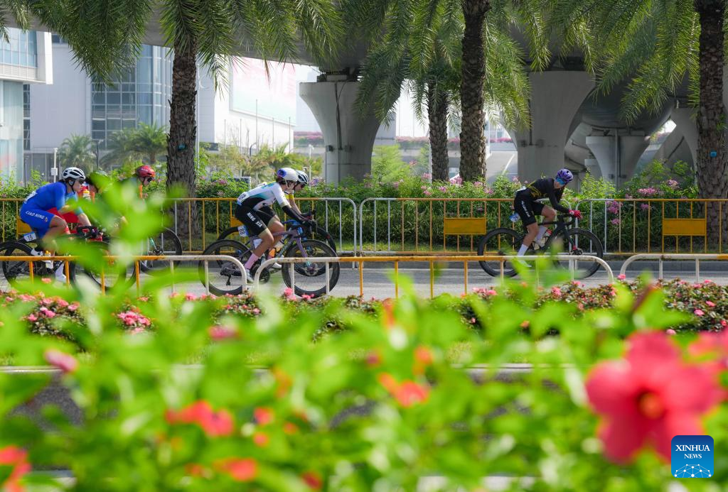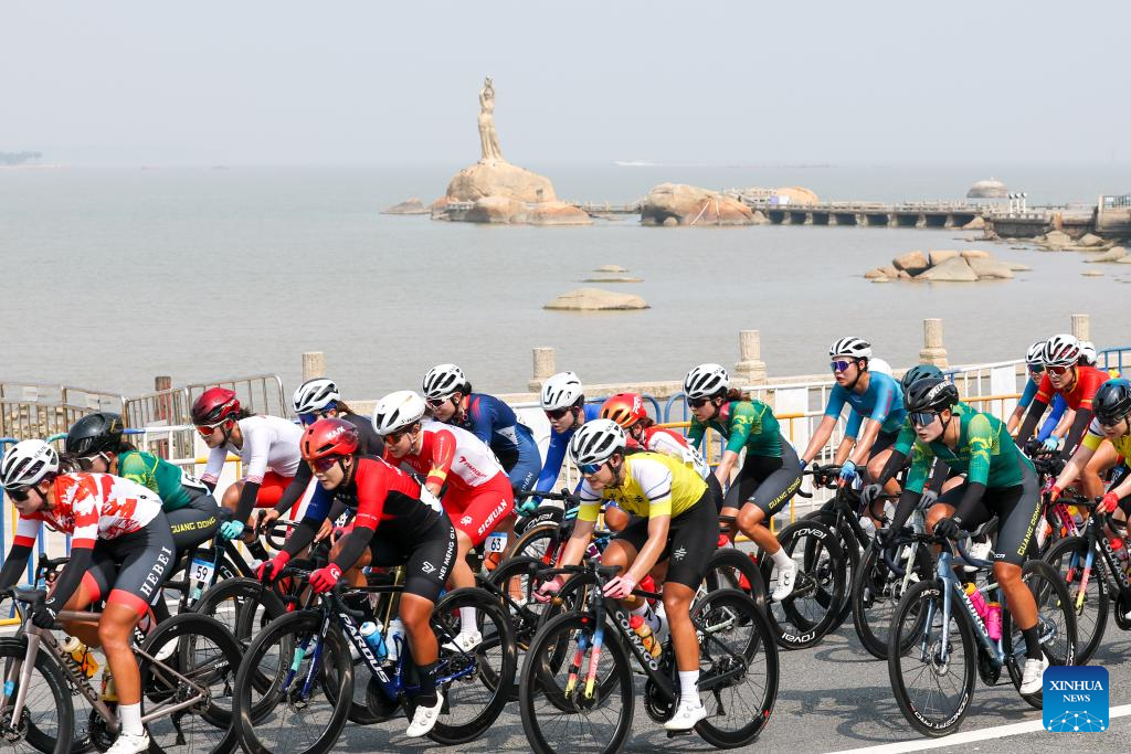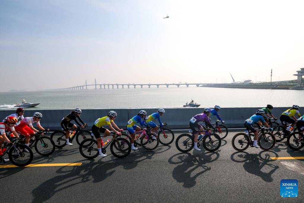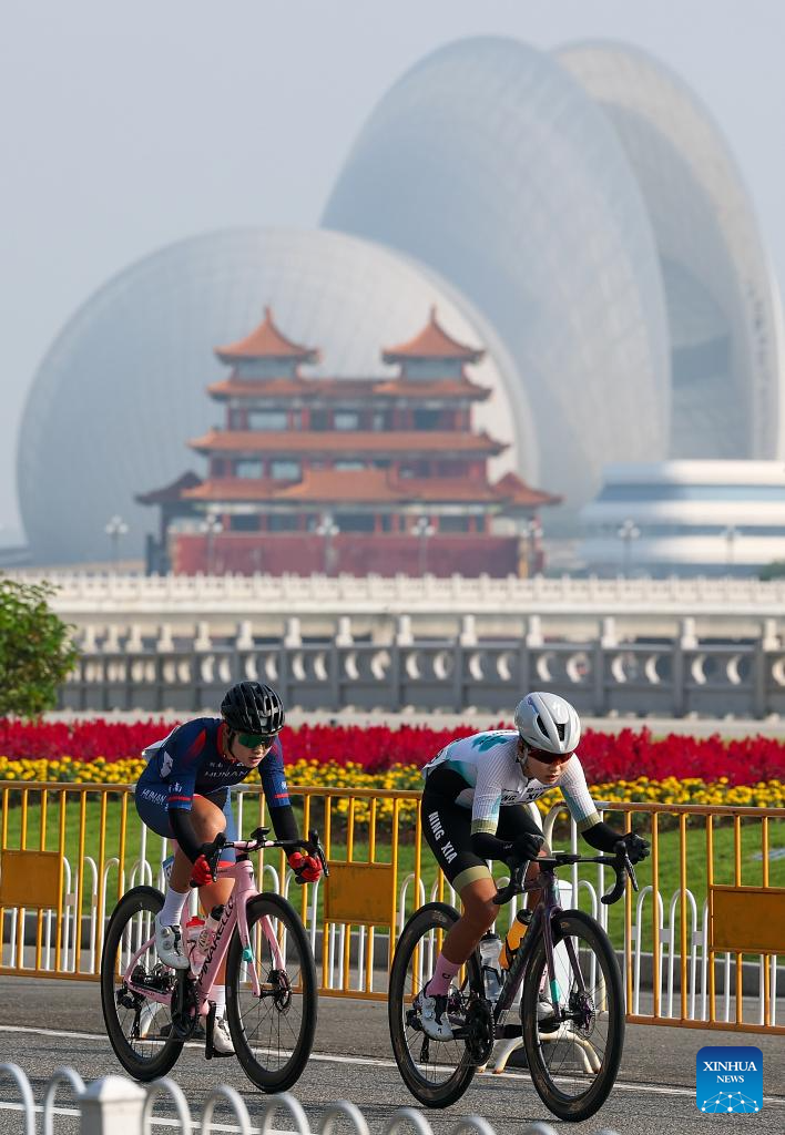Cyclists compete during the women's road race of cycling road at China's 15th National Games in south China's Guangdong Province, Nov. 9, 2025. (Xinhua/Yan Linyun)