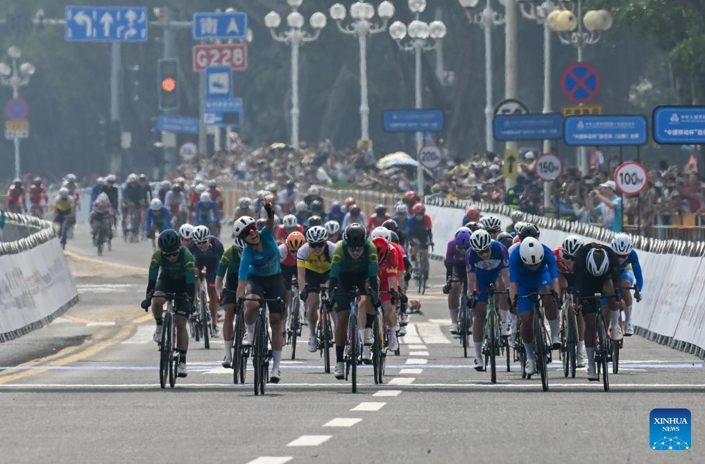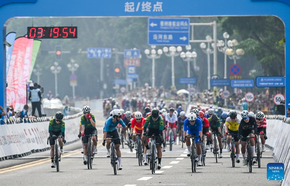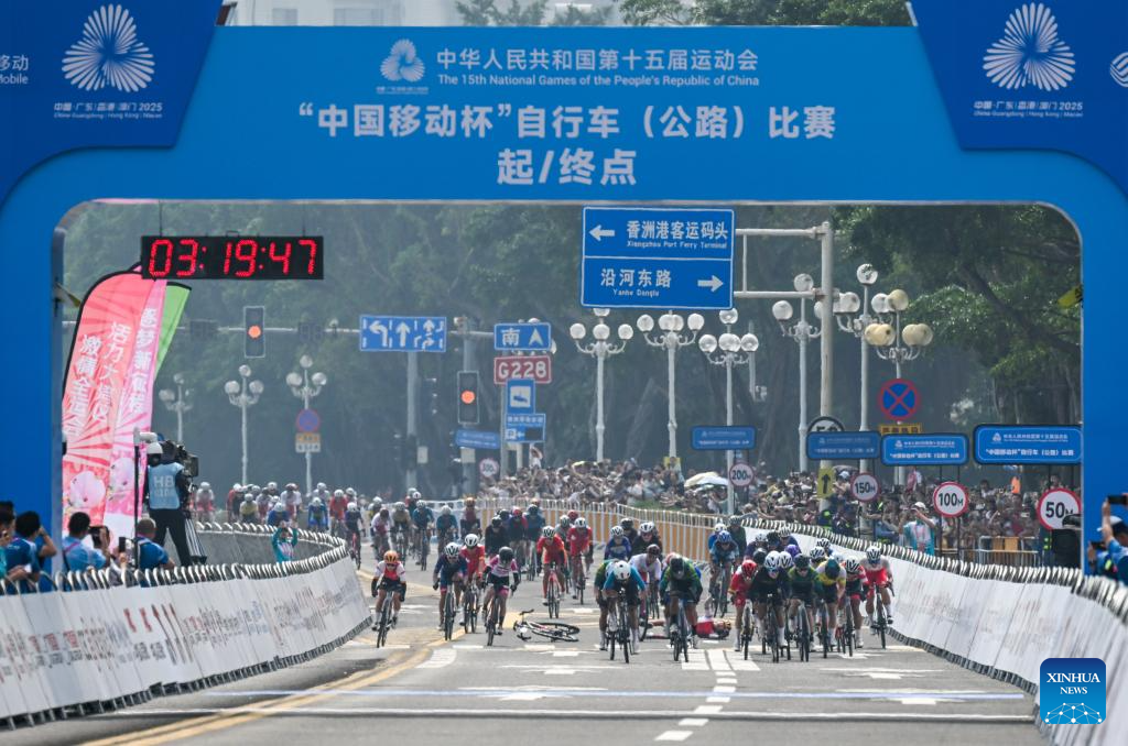 Cyclists cross the finish line during the women's road race of cycling road at China's 15th National Games in south China's Guangdong Province, Nov. 9, 2025. (Xinhua/Lian Zhen)