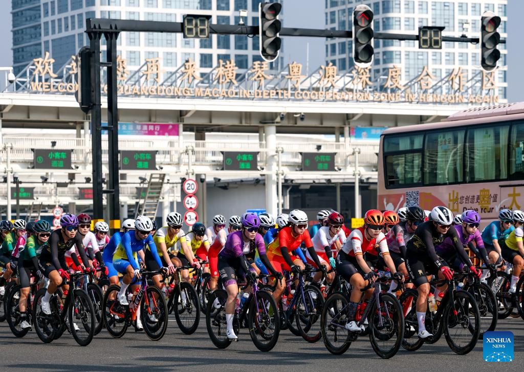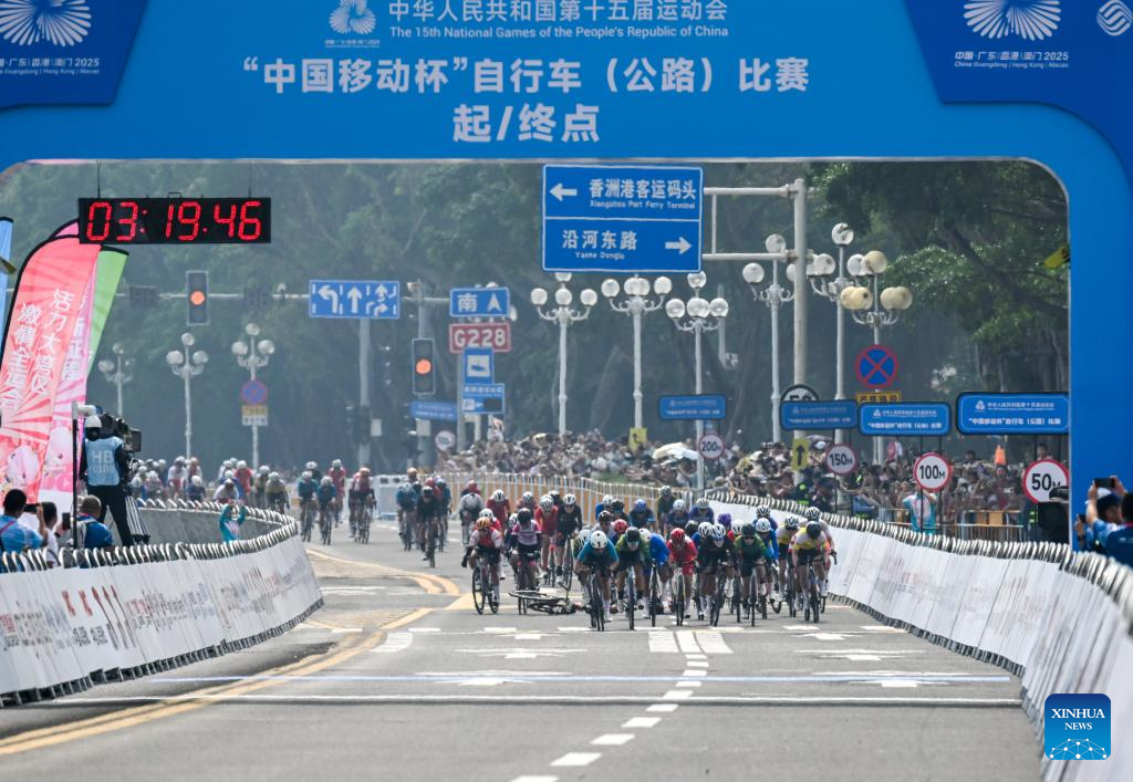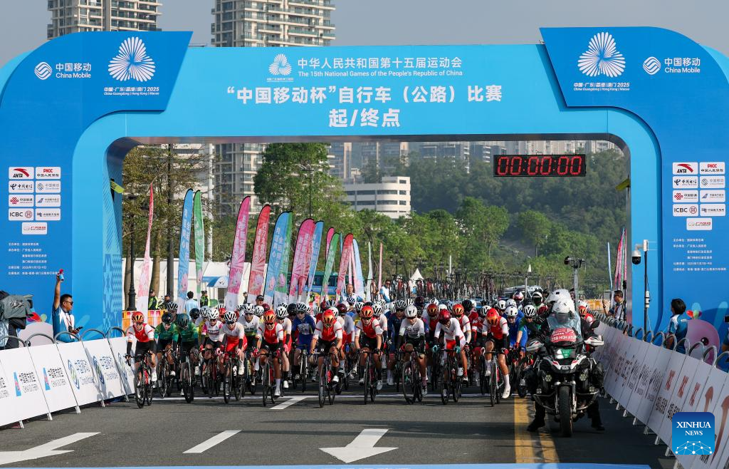 Cyclists start during the women's road race of cycling road at China's 15th National Games in south China's Guangdong Province, Nov. 9, 2025. (Xinhua/Mao Siqian)
