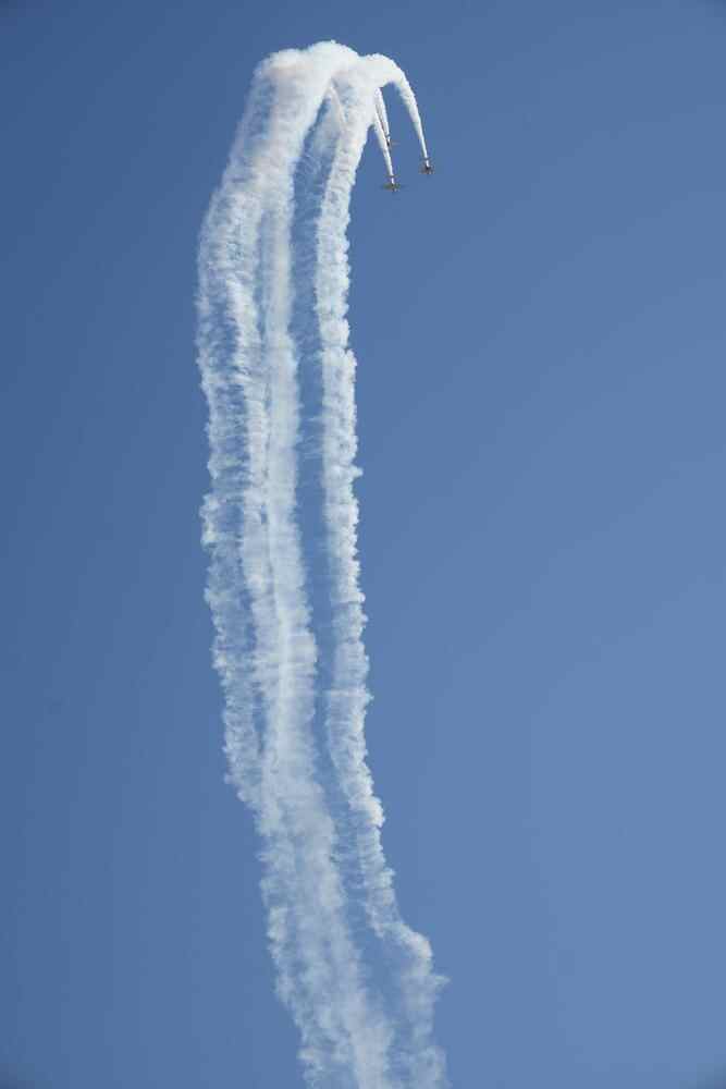 The most spectacular moment occurred around 11 AM when the four planes, facing the audience in a horizontal formation, separated one by one. The smoke trails converged to form a phoenix-tail shape, a customized highlight for this airshow.