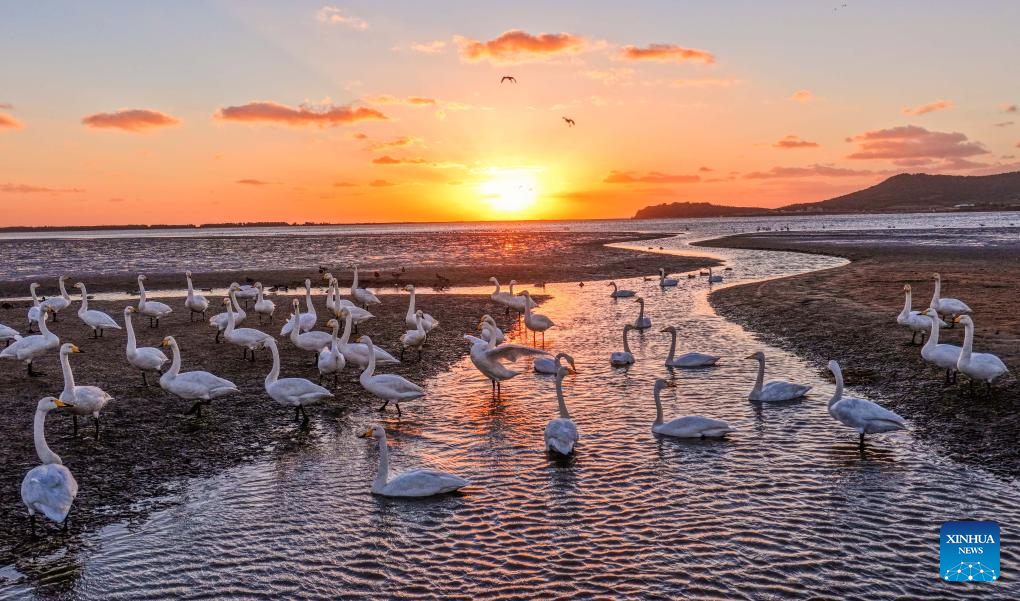 A drone photo taken on Nov. 2, 2025 shows a morning view of Swan Lake wetland in Rongcheng City, east China's Shandong Province. (Photo by Li Xinjun/Xinhua)