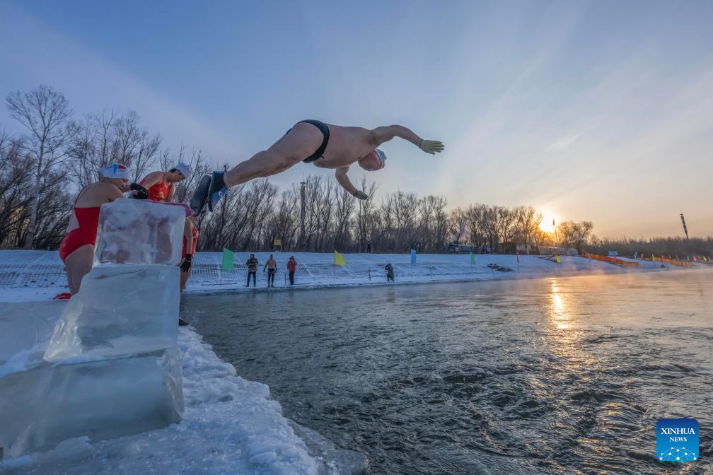 Winter swimming enthusiasts swim at a winter swimming base in Qiqihar City, northeast China's Heilongjiang Province, on Jan. 1, 2026.