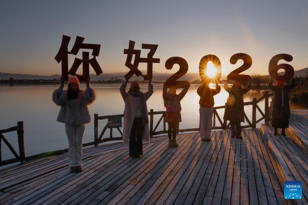 People enjoy the sunrise at a sightseeing platform in Eryuan County, southwest China's Yunnan Province, Jan. 1, 2026.