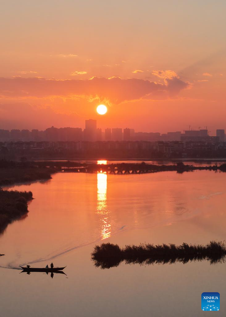 An aerial drone photo taken on Jan. 1, 2026 shows the sunrise scenery at a wetland park in Kunming, southwest China's Yunnan Province.