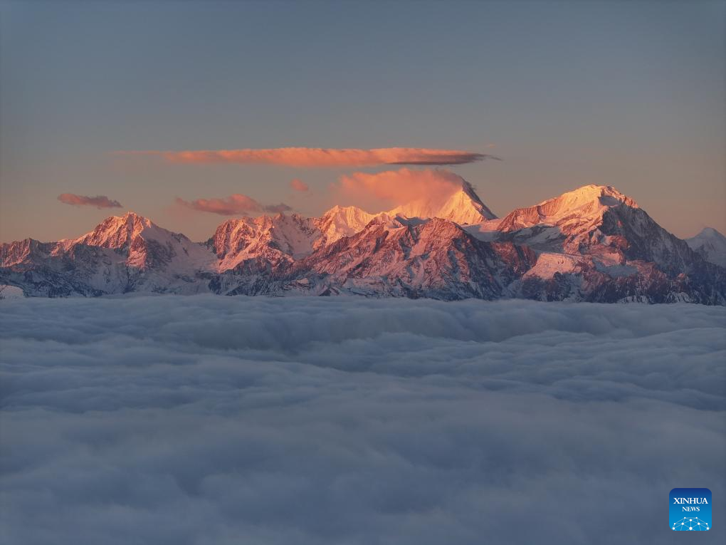 A drone photo taken in Luding County of southwest China's Sichuan Province shows a view of Mount Gongga at sunrise on Jan. 1, 2026.
