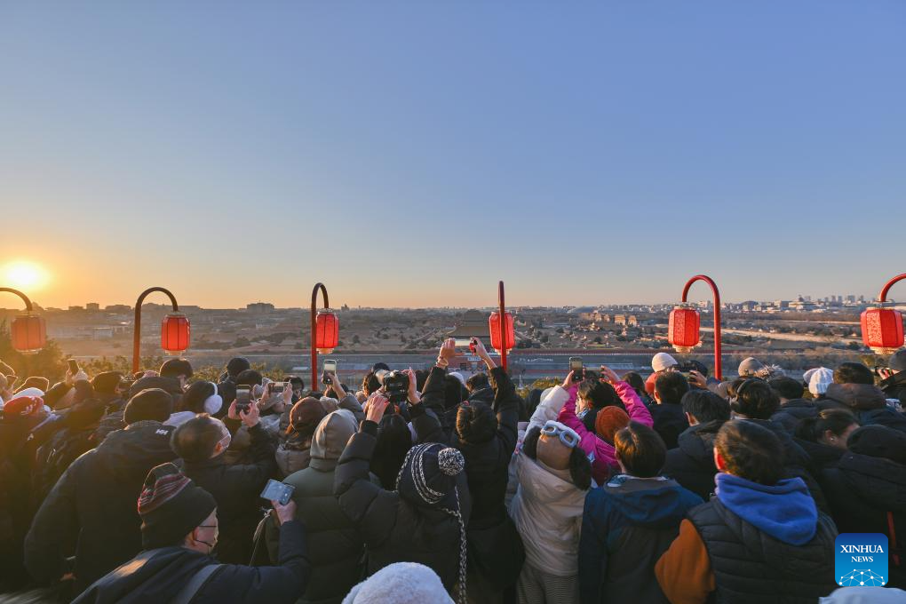 People take photos of the sunrise scenery at the Jingshan Park in Beijing, capital of China, on Jan. 1, 2026.