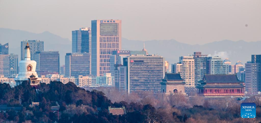 This photo taken on Jan. 1, 2026 shows the Bell and Drum Tower and the White Pagoda of Beihai Park at sunrise in Beijing, capital of China.
