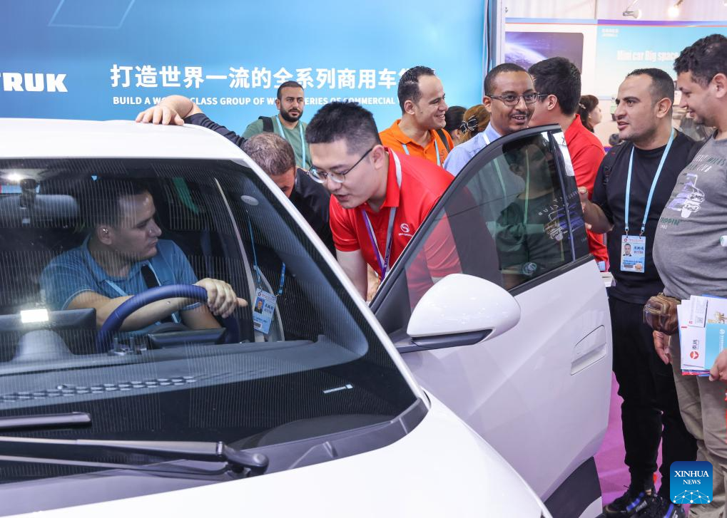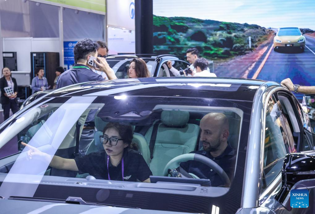 A purchaser learns about an electric vehicle during the 135th session of the China Import and Export Fair in Guangzhou, south China's Guangdong Province, April 15, 2024. Electric vehicles, solar batteries and lithium-ion batteries, categorized as China's tech-intensive and green "new three," reported a combined export value of 1.06 trillion yuan (150 billion dollars) in 2023, jumping 29.9 percent year on year. Lots of exhibitors in the related industries showcase various products in the ongoing 135th session of the China Import and Export Fair, also known as the Canton Fair, in Guangzhou. (Xinhua/Liu Dawei)