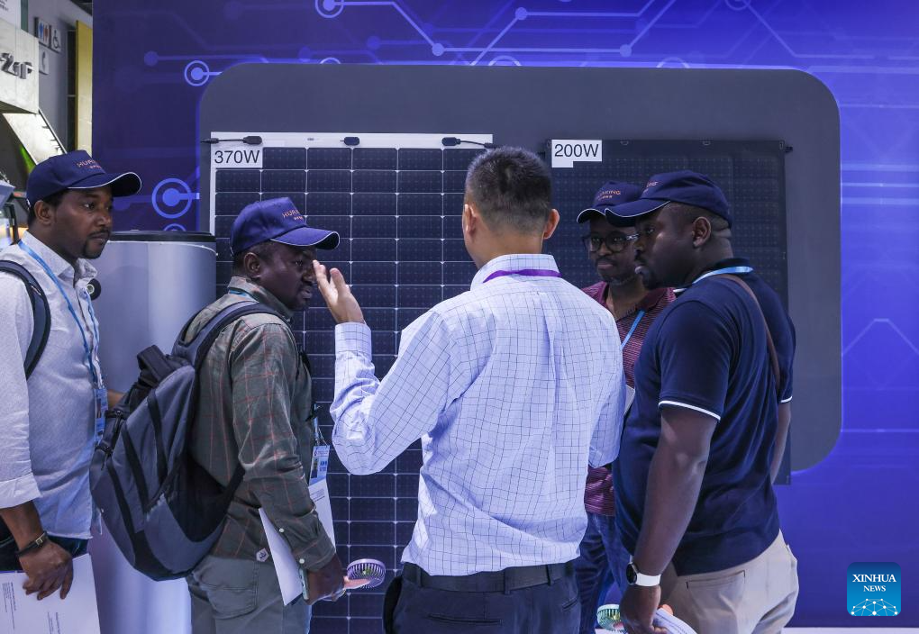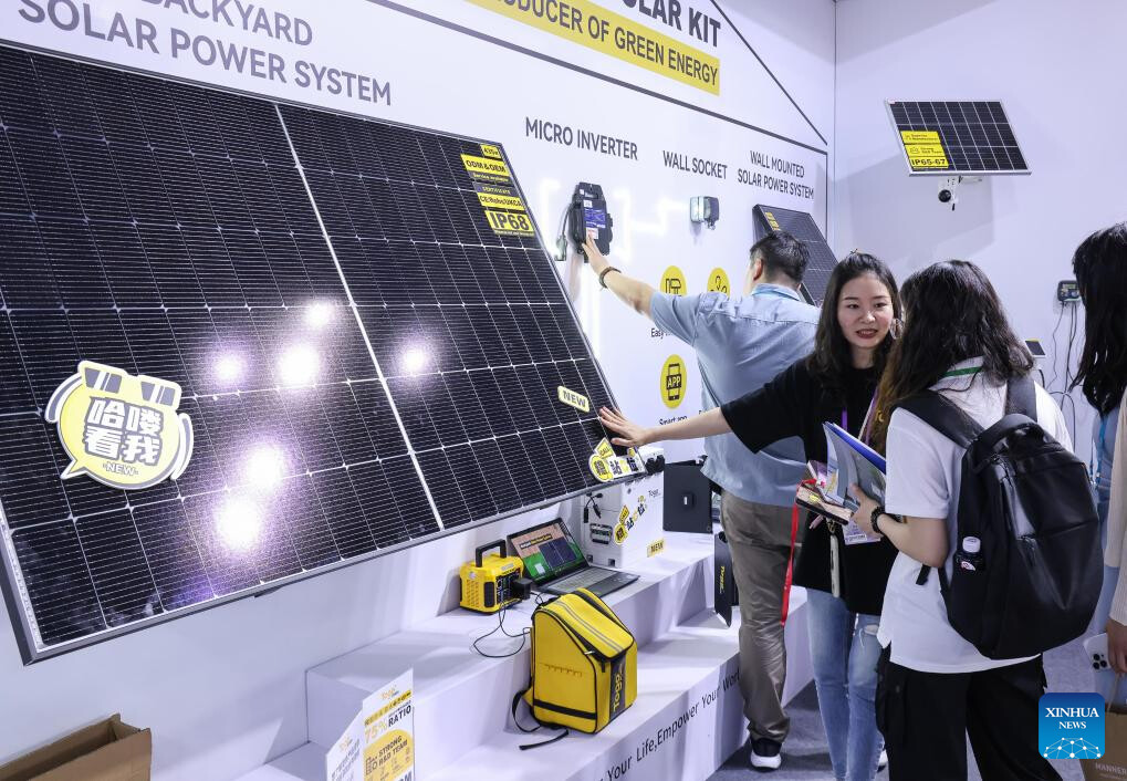 Purchasers learn about solar power generation equipment during the 135th session of the China Import and Export Fair in Guangzhou, south China's Guangdong Province, April 16, 2024. Electric vehicles, solar batteries and lithium-ion batteries, categorized as China's tech-intensive and green "new three," reported a combined export value of 1.06 trillion yuan (150 billion dollars) in 2023, jumping 29.9 percent year on year. Lots of exhibitors in the related industries showcase various products in the ongoing 135th session of the China Import and Export Fair, also known as the Canton Fair, in Guangzhou. (Xinhua/Lu Hanxin)