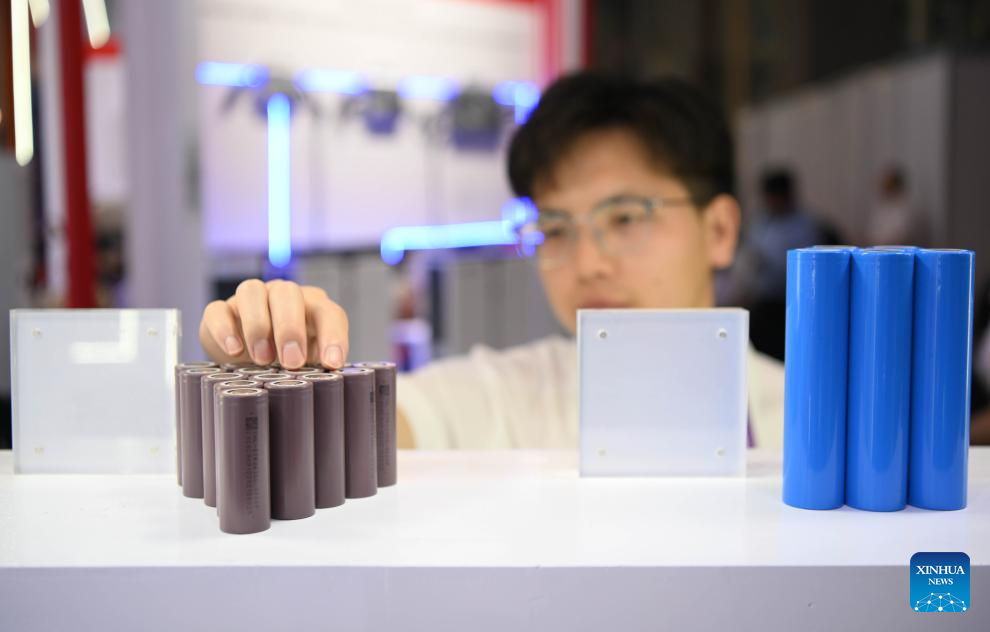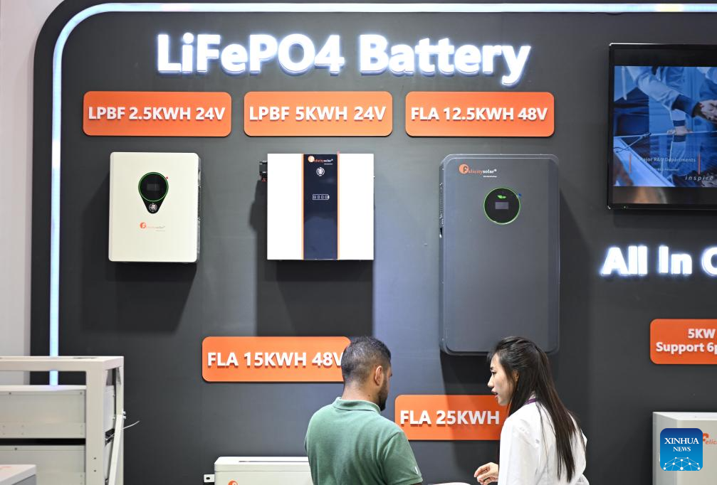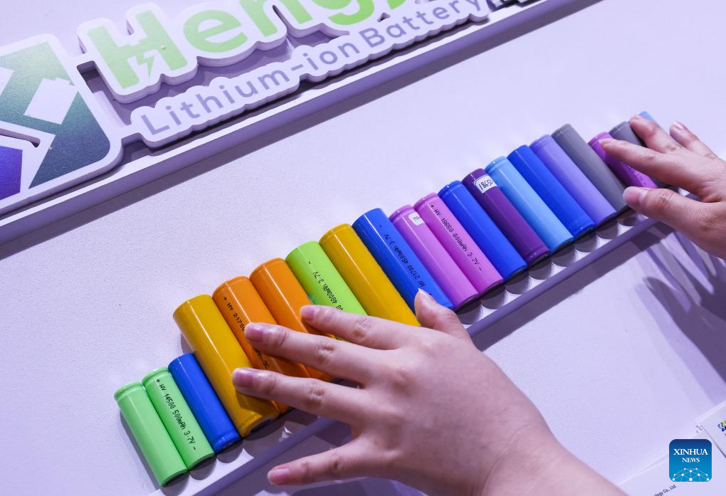 Lithium battery products are pictured during the 135th session of the China Import and Export Fair in Guangzhou, south China's Guangdong Province, April 15, 2024. Electric vehicles, solar batteries and lithium-ion batteries, categorized as China's tech-intensive and green "new three," reported a combined export value of 1.06 trillion yuan (150 billion dollars) in 2023, jumping 29.9 percent year on year. Lots of exhibitors in the related industries showcase various products in the ongoing 135th session of the China Import and Export Fair, also known as the Canton Fair, in Guangzhou. (Xinhua/Deng Hua)