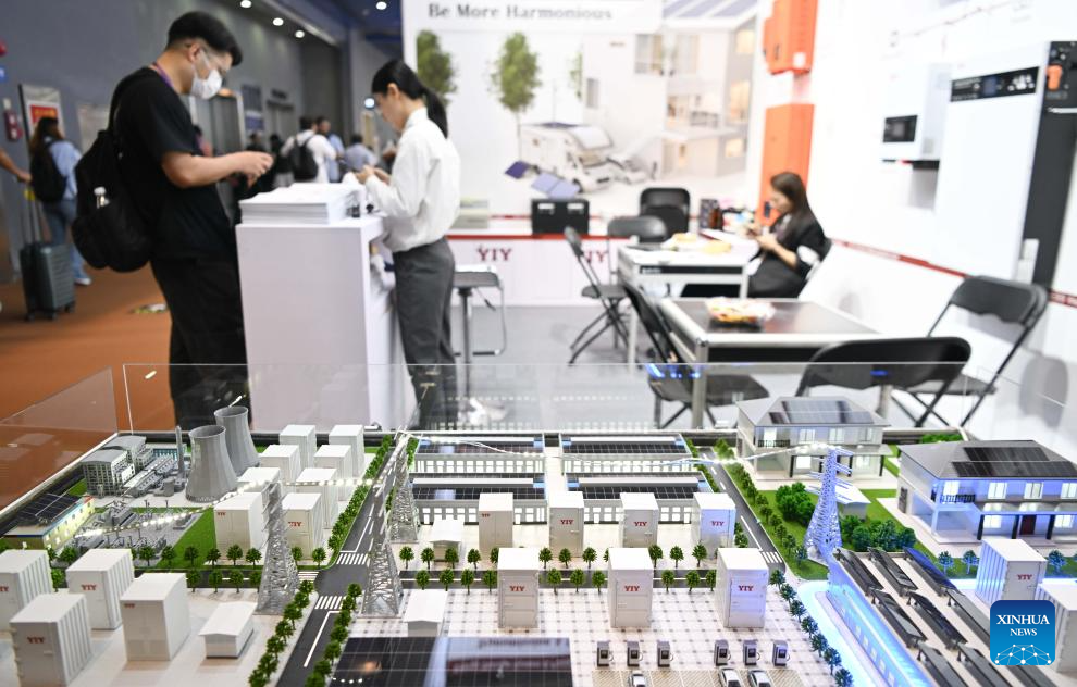 This photo taken on April 15, 2024 shows an energy utilization solution exhibited at a booth during the 135th session of the China Import and Export Fair in Guangzhou, south China's Guangdong Province. Electric vehicles, solar batteries and lithium-ion batteries, categorized as China's tech-intensive and green "new three," reported a combined export value of 1.06 trillion yuan (150 billion dollars) in 2023, jumping 29.9 percent year on year. Lots of exhibitors in the related industries showcase various products in the ongoing 135th session of the China Import and Export Fair, also known as the Canton Fair, in Guangzhou. (Xinhua/Deng Hua)