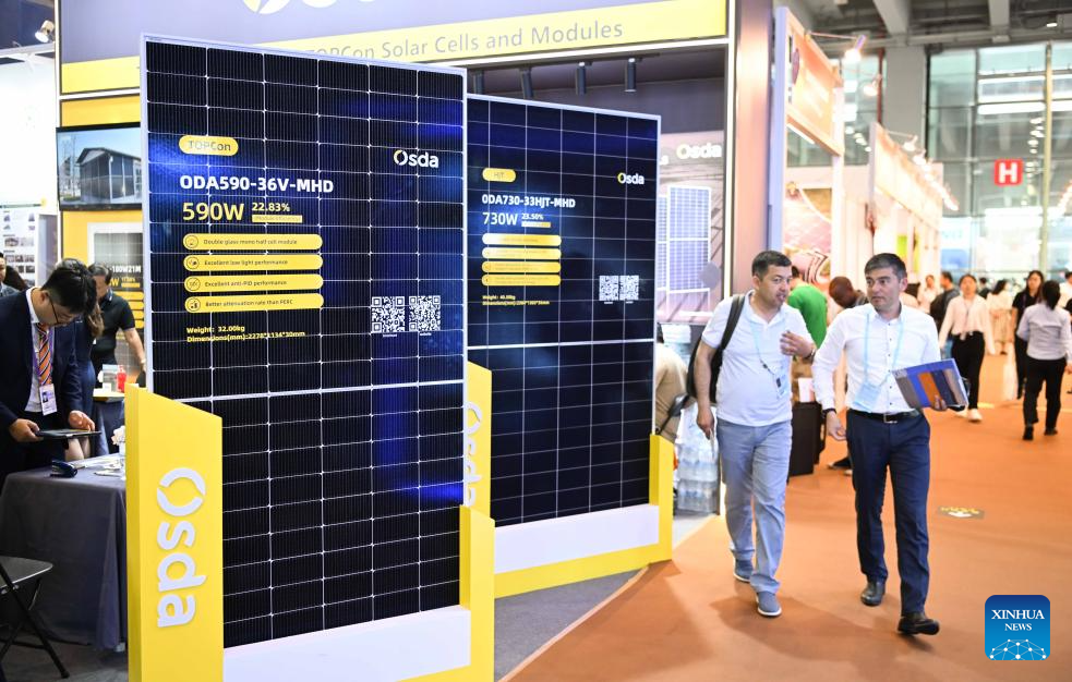 Overseas purchasers walk past a booth exhibiting solar battery products during the 135th session of the China Import and Export Fair in Guangzhou, south China's Guangdong Province, April 15, 2024. Electric vehicles, solar batteries and lithium-ion batteries, categorized as China's tech-intensive and green "new three," reported a combined export value of 1.06 trillion yuan (150 billion dollars) in 2023, jumping 29.9 percent year on year. Lots of exhibitors in the related industries showcase various products in the ongoing 135th session of the China Import and Export Fair, also known as the Canton Fair, in Guangzhou. (Xinhua/Deng Hua)