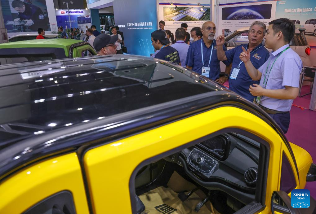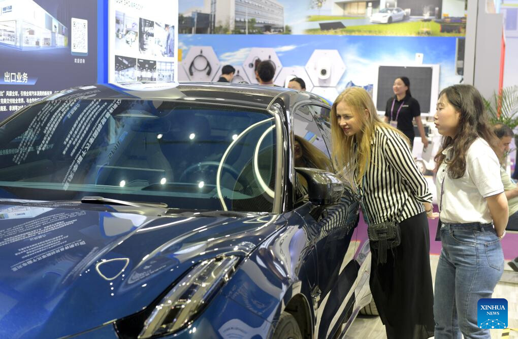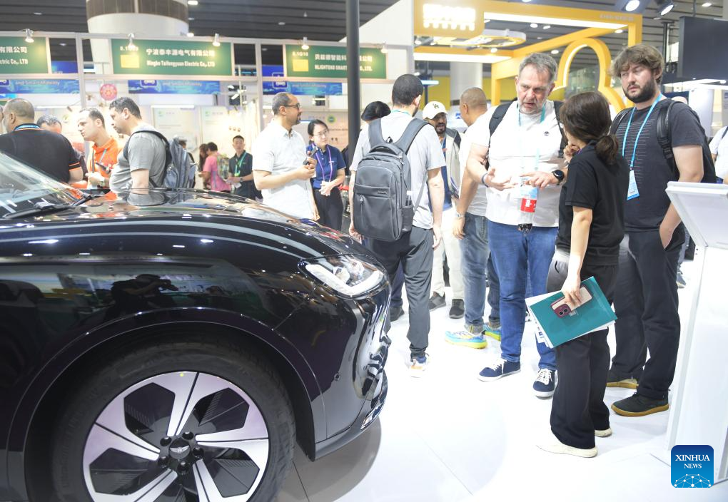 Purchasers learn about an electric vehicle during the 135th session of the China Import and Export Fair in Guangzhou, south China's Guangdong Province, April 15, 2024. Electric vehicles, solar batteries and lithium-ion batteries, categorized as China's tech-intensive and green "new three," reported a combined export value of 1.06 trillion yuan (150 billion dollars) in 2023, jumping 29.9 percent year on year. Lots of exhibitors in the related industries showcase various products in the ongoing 135th session of the China Import and Export Fair, also known as the Canton Fair, in Guangzhou. (Xinhua/Liu Dawei)