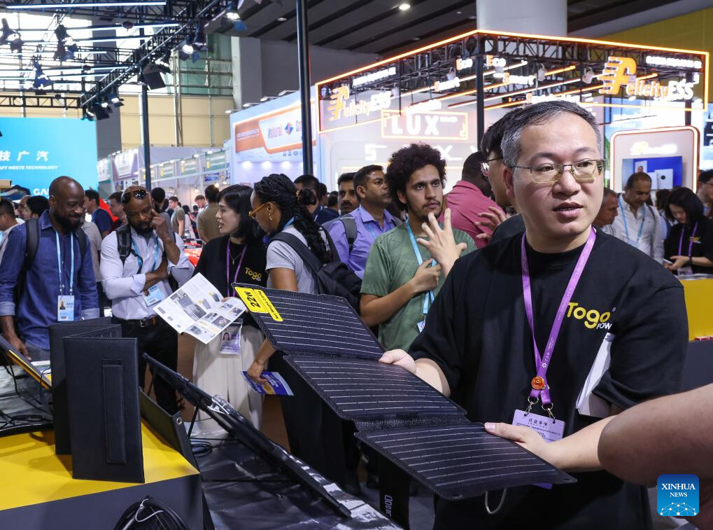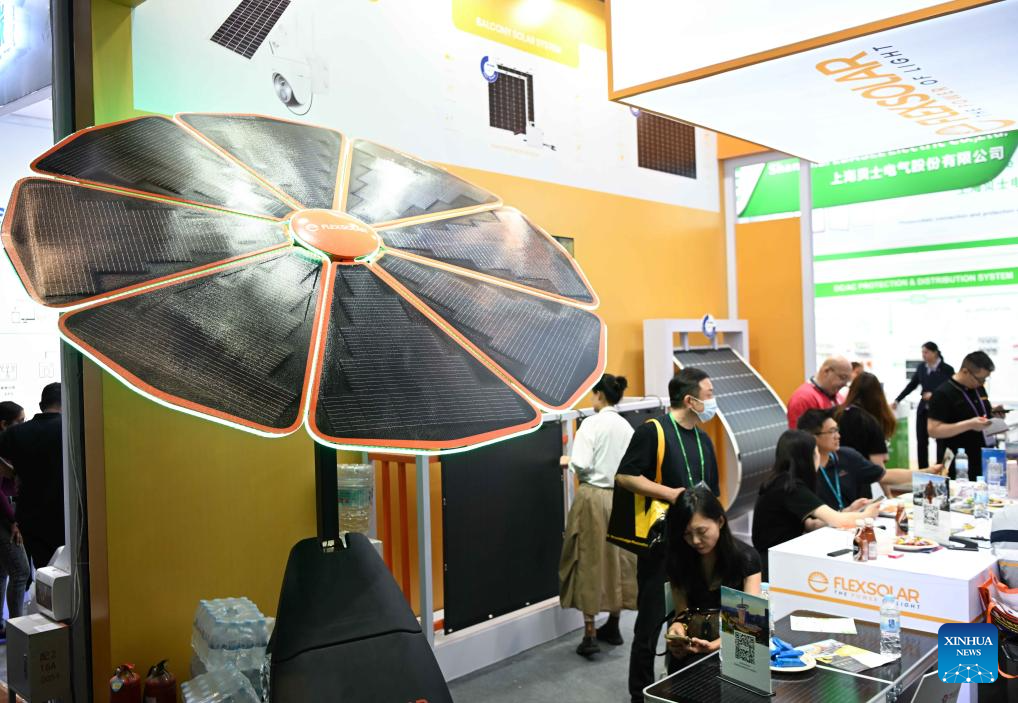 An exhibitor displays a foldable solar battery module exhibit during the 135th session of the China Import and Export Fair in Guangzhou, south China's Guangdong Province, April 15, 2024. Electric vehicles, solar batteries and lithium-ion batteries, categorized as China's tech-intensive and green "new three," reported a combined export value of 1.06 trillion yuan (150 billion dollars) in 2023, jumping 29.9 percent year on year. Lots of exhibitors in the related industries showcase various products in the ongoing 135th session of the China Import and Export Fair, also known as the Canton Fair, in Guangzhou. (Xinhua/Liu Dawei)