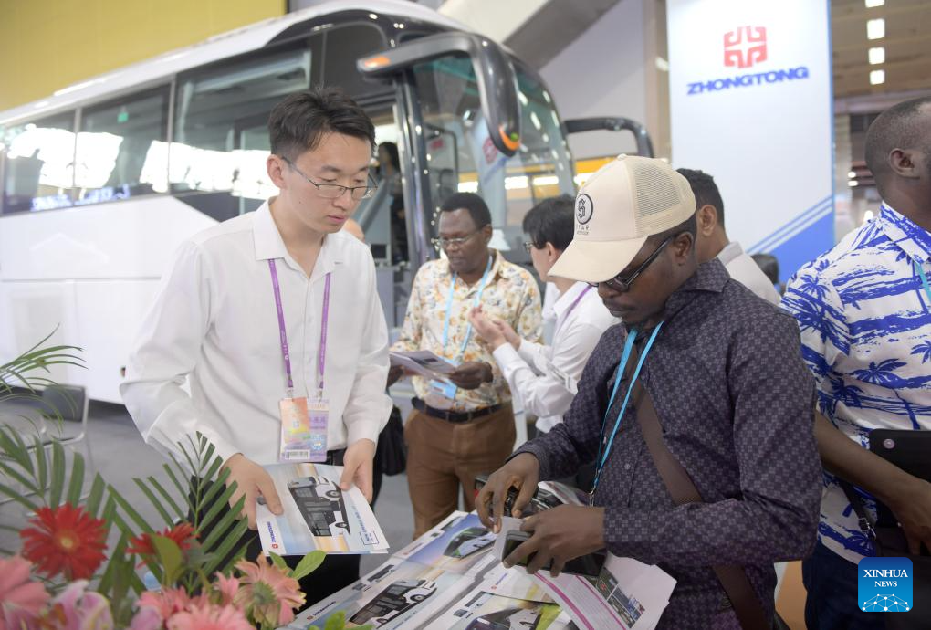 A purchaser learns about electric buses at a booth during the 135th session of the China Import and Export Fair in Guangzhou, south China's Guangdong Province, April 15, 2024. Electric vehicles, solar batteries and lithium-ion batteries, categorized as China's tech-intensive and green "new three," reported a combined export value of 1.06 trillion yuan (150 billion dollars) in 2023, jumping 29.9 percent year on year. Lots of exhibitors in the related industries showcase various products in the ongoing 135th session of the China Import and Export Fair, also known as the Canton Fair, in Guangzhou. (Xinhua/Lu Hanxin)