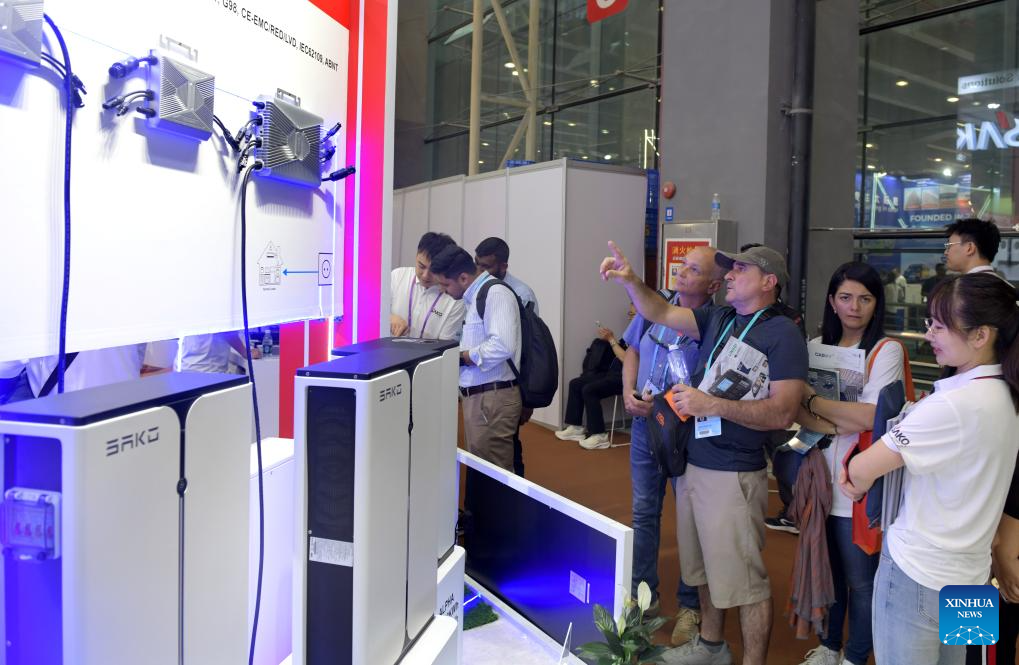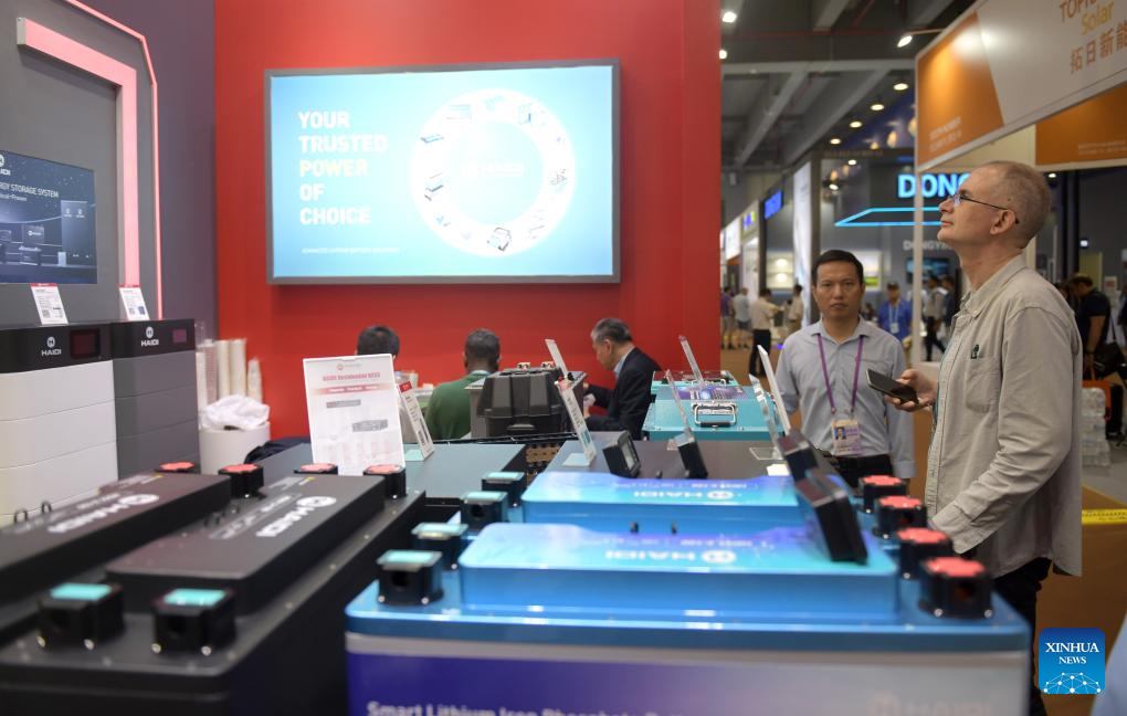 A purchaser learns about energy storage equipment at a booth during the 135th session of the China Import and Export Fair in Guangzhou, south China's Guangdong Province, April 16, 2024. Electric vehicles, solar batteries and lithium-ion batteries, categorized as China's tech-intensive and green "new three," reported a combined export value of 1.06 trillion yuan (150 billion dollars) in 2023, jumping 29.9 percent year on year. Lots of exhibitors in the related industries showcase various products in the ongoing 135th session of the China Import and Export Fair, also known as the Canton Fair, in Guangzhou. (Xinhua/Lu Hanxin)