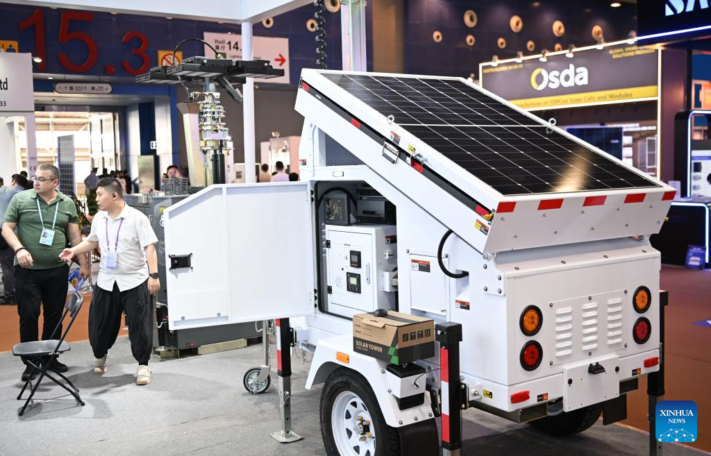 This photo taken on April 15, 2024 shows an outdoor solar energy monitoring vehicle exhibited at a booth during the 135th session of the China Import and Export Fair in Guangzhou, south China's Guangdong Province. Electric vehicles, solar batteries and lithium-ion batteries, categorized as China's tech-intensive and green "new three," reported a combined export value of 1.06 trillion yuan (150 billion dollars) in 2023, jumping 29.9 percent year on year. Lots of exhibitors in the related industries showcase various products in the ongoing 135th session of the China Import and Export Fair, also known as the Canton Fair, in Guangzhou. (Xinhua/Deng Hua)